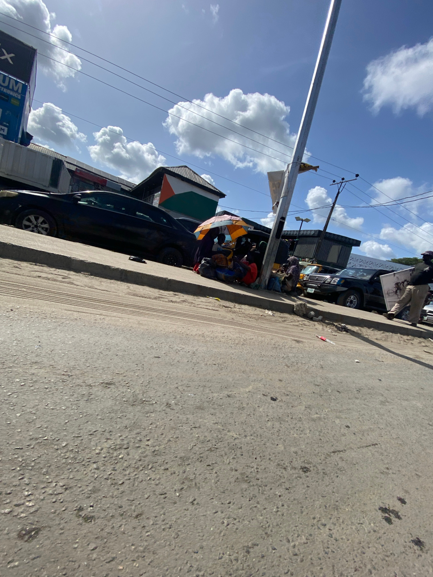 The image shows a street scene in Lekki, Nigeria. Along the roadside, several vendors and customers are gathered under umbrellas and awnings, likely engaged in commerce. A black car is parked nearby.…read more