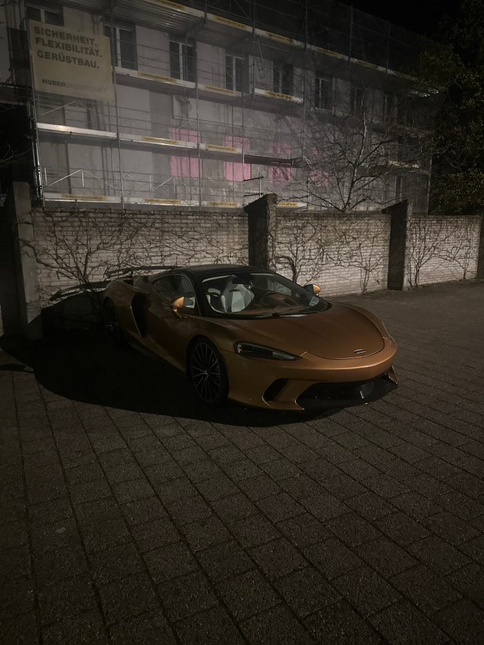 The image displays a metallic bronze convertible sports car, identified as a McLaren, parked on dark grey rectangular block paving at night in Dietlikon, Switzerland. The vehicle is angled towards the…read more