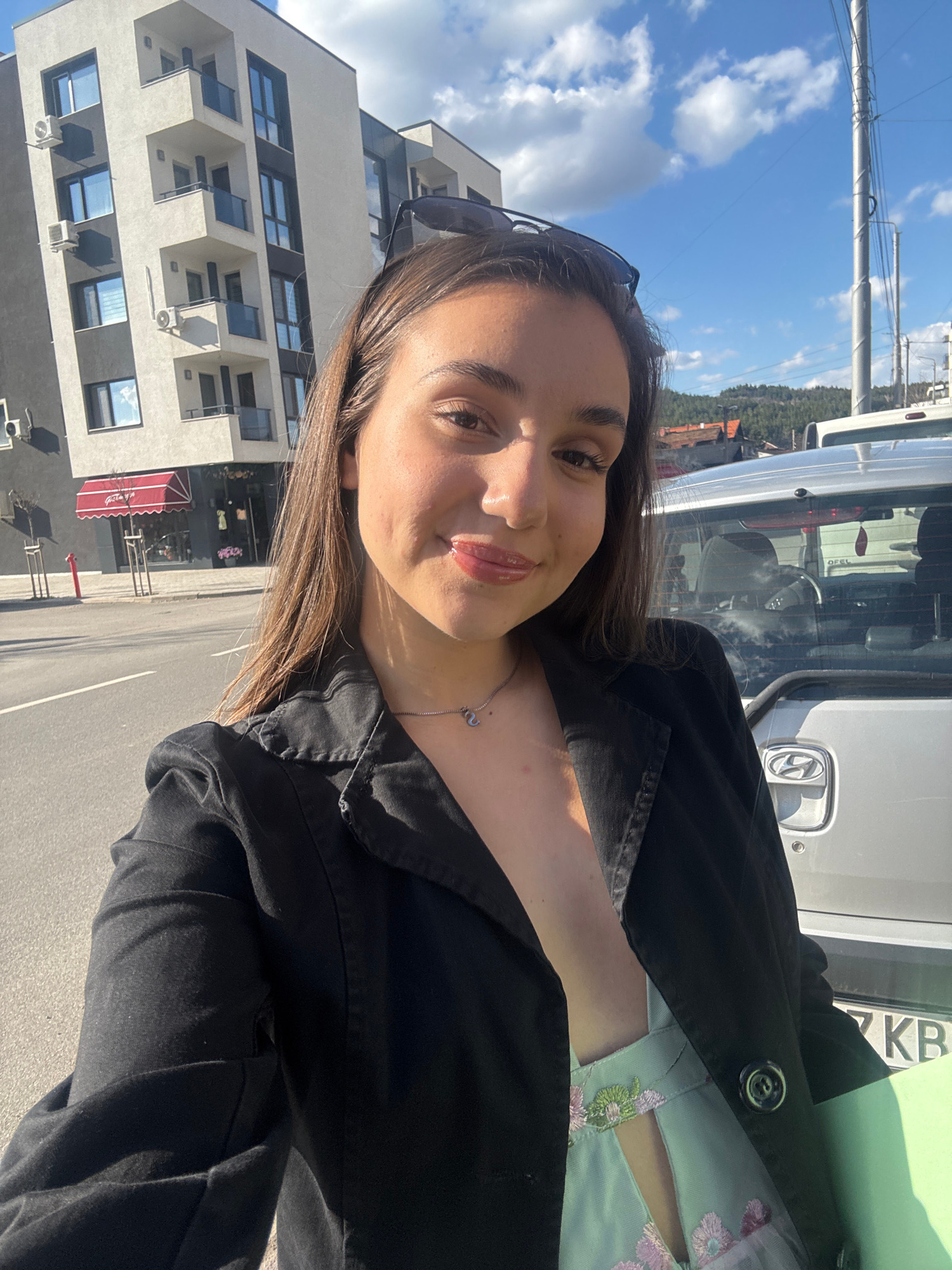 A selfie of a woman with brown hair, wearing a black jacket over a light-colored floral top and a necklace, taken outdoors on a sunny day in Pernik, Bulgaria. In the background, there is a gray SUV wi…read more