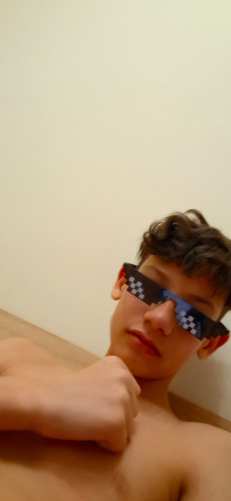 A person with fair skin is positioned diagonally in the frame, wearing pixelated sunglasses. The person has dark curly hair. Their left fist is clenched and held near their chest. The background is a…read more