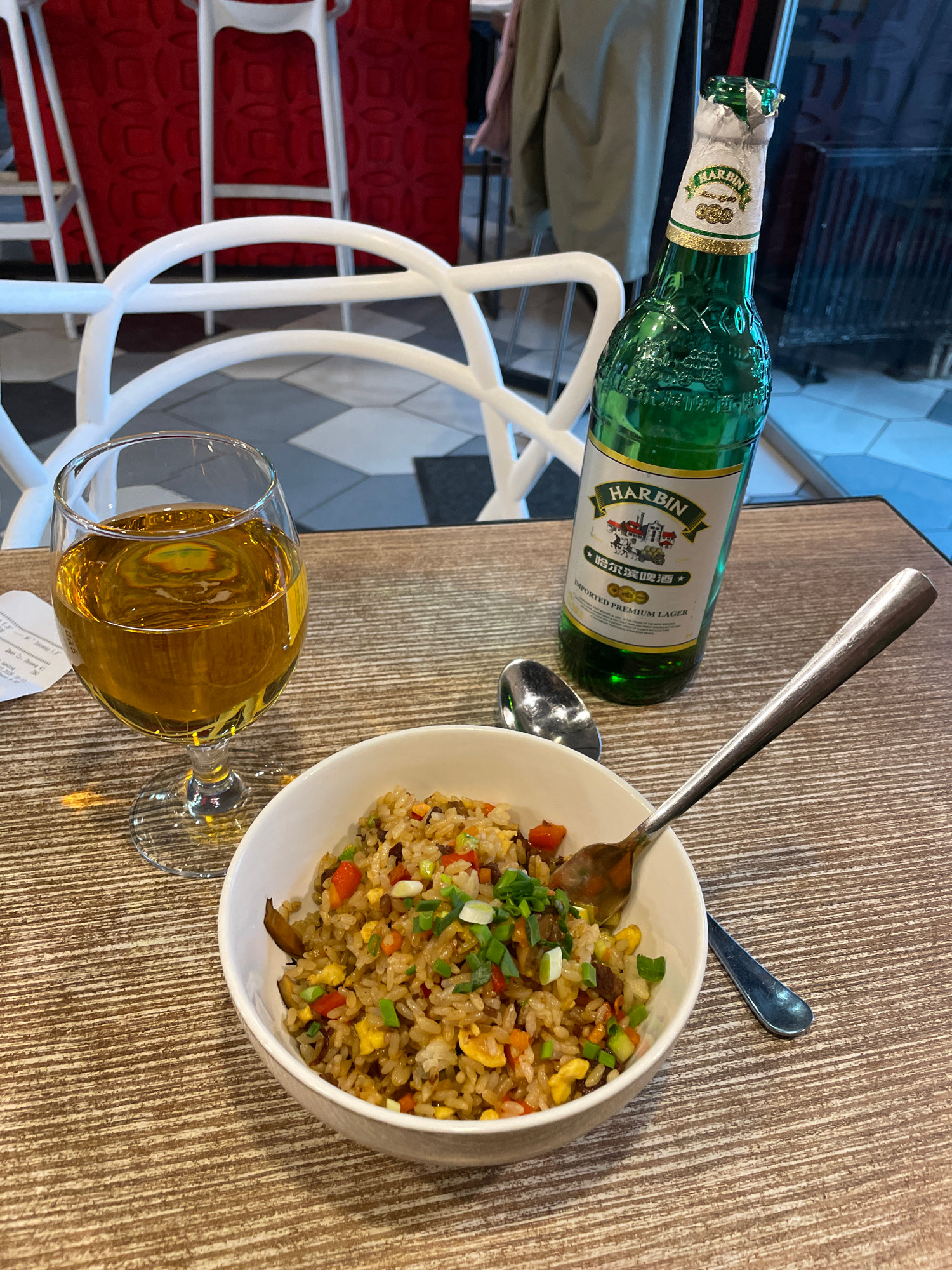 A detailed image depicts a meal setting on a light brown, horizontally wood-grained table surface within a dining establishment in Yekaterinburg, Russia. In the foreground, a white ceramic bowl contai…read more