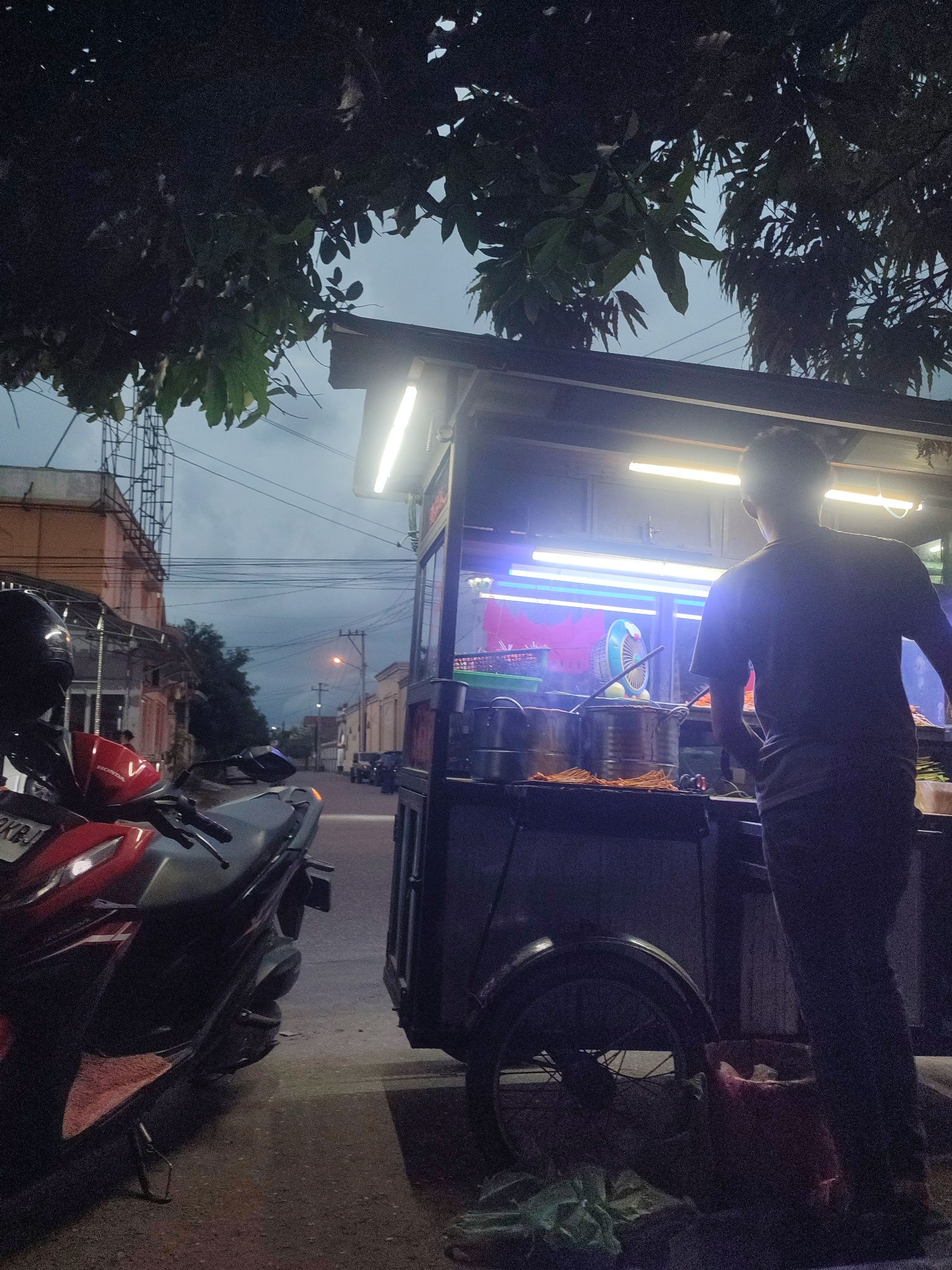 The image shows a street scene in Lhokseumawe, Indonesia at night. A man is standing next to a food cart illuminated by fluorescent lights. The cart appears to be set up for cooking or serving food, a…read more