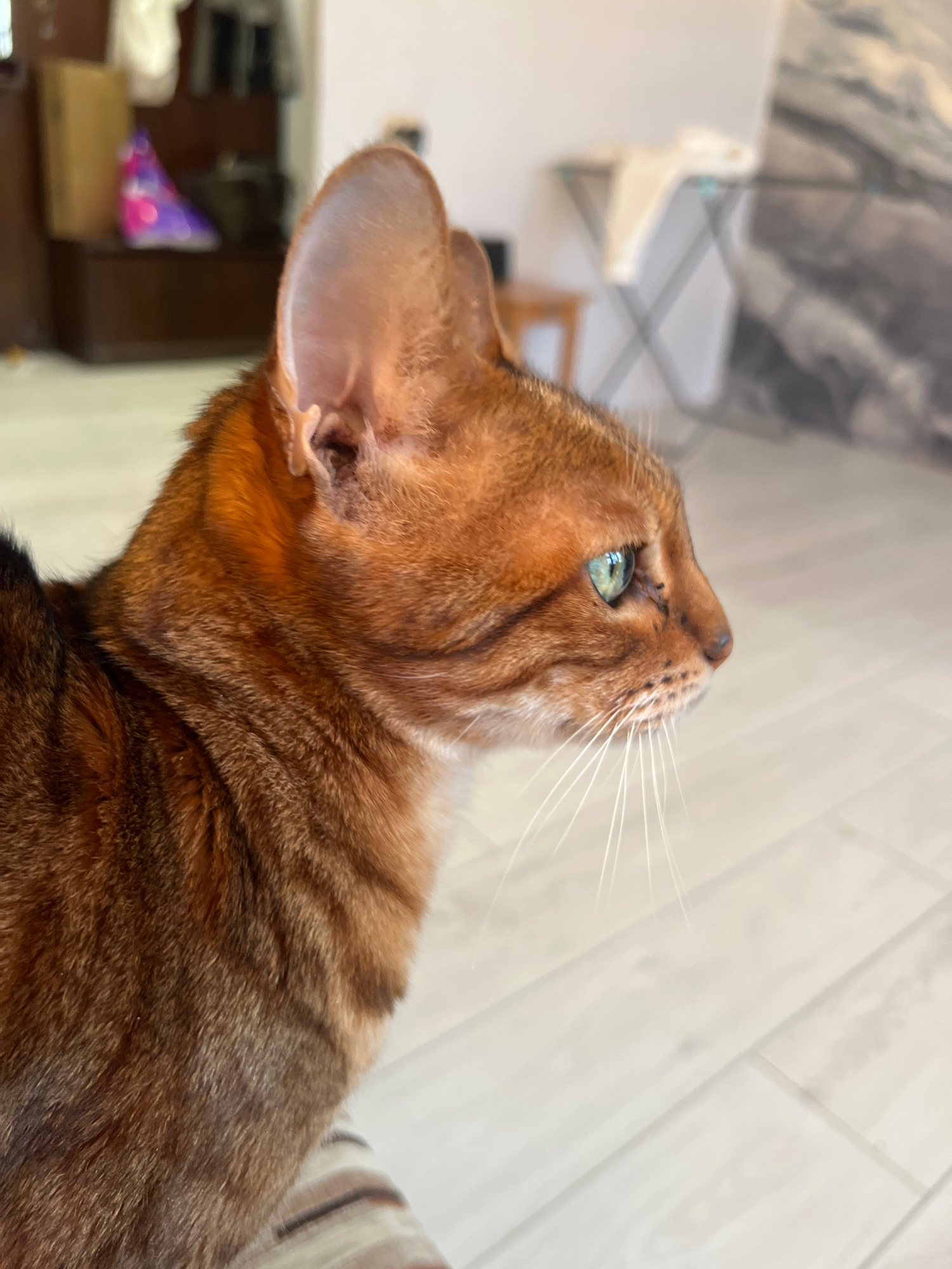 A close-up shot reveals a brown Bengal cat looking upwards with bright green eyes and long, white whiskers. The cat's fur displays distinct brown markings. The background includes a section of what ap…read more