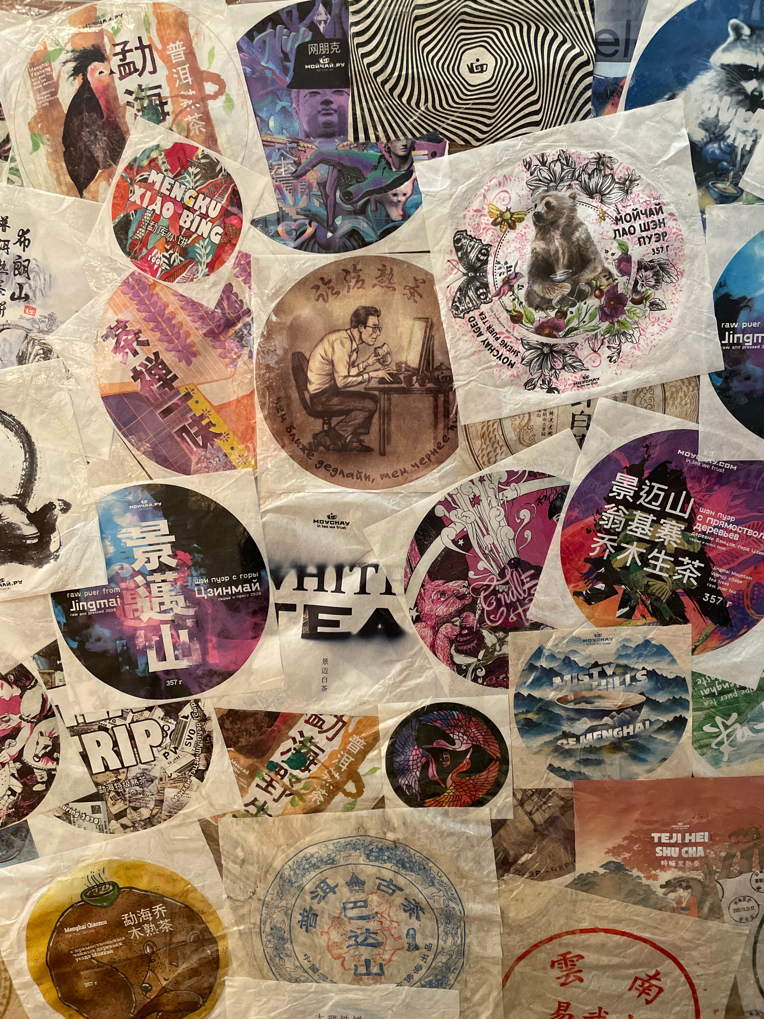 The image displays a close-up, overhead view of a collection of circular and semi-circular paper wrappers, likely for tea cakes, arranged in an overlapping, collage-like fashion on a light-colored sur…read more