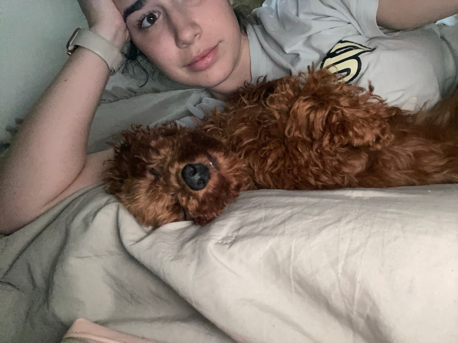 A woman and a brown dog are lying on a bed. The woman is on her left side with her head propped up by her left arm. She is wearing a light-colored t-shirt and a watch. The dog is lying next to her, fa…read more