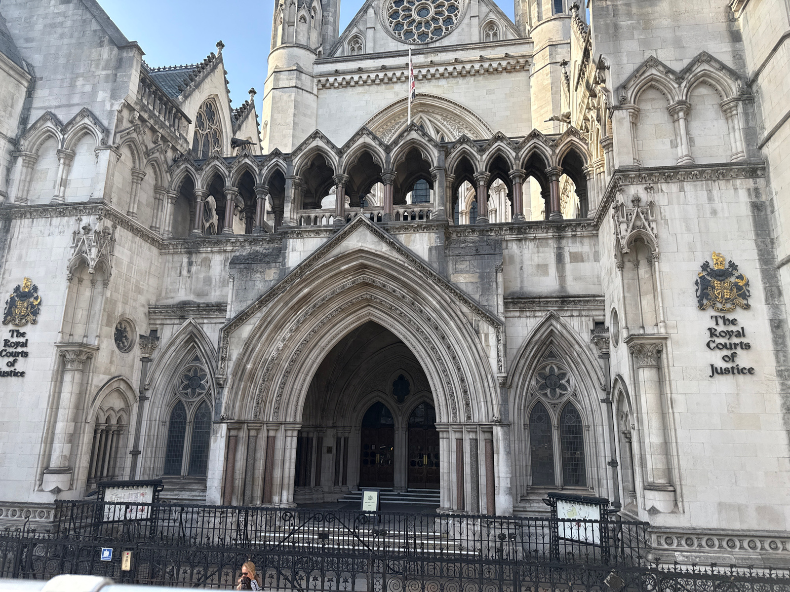 The image shows the Royal Courts of Justice in London, United Kingdom. It is a large, ornate building with Gothic architectural details. The facade features multiple arches, columns, windows, and ston…read more