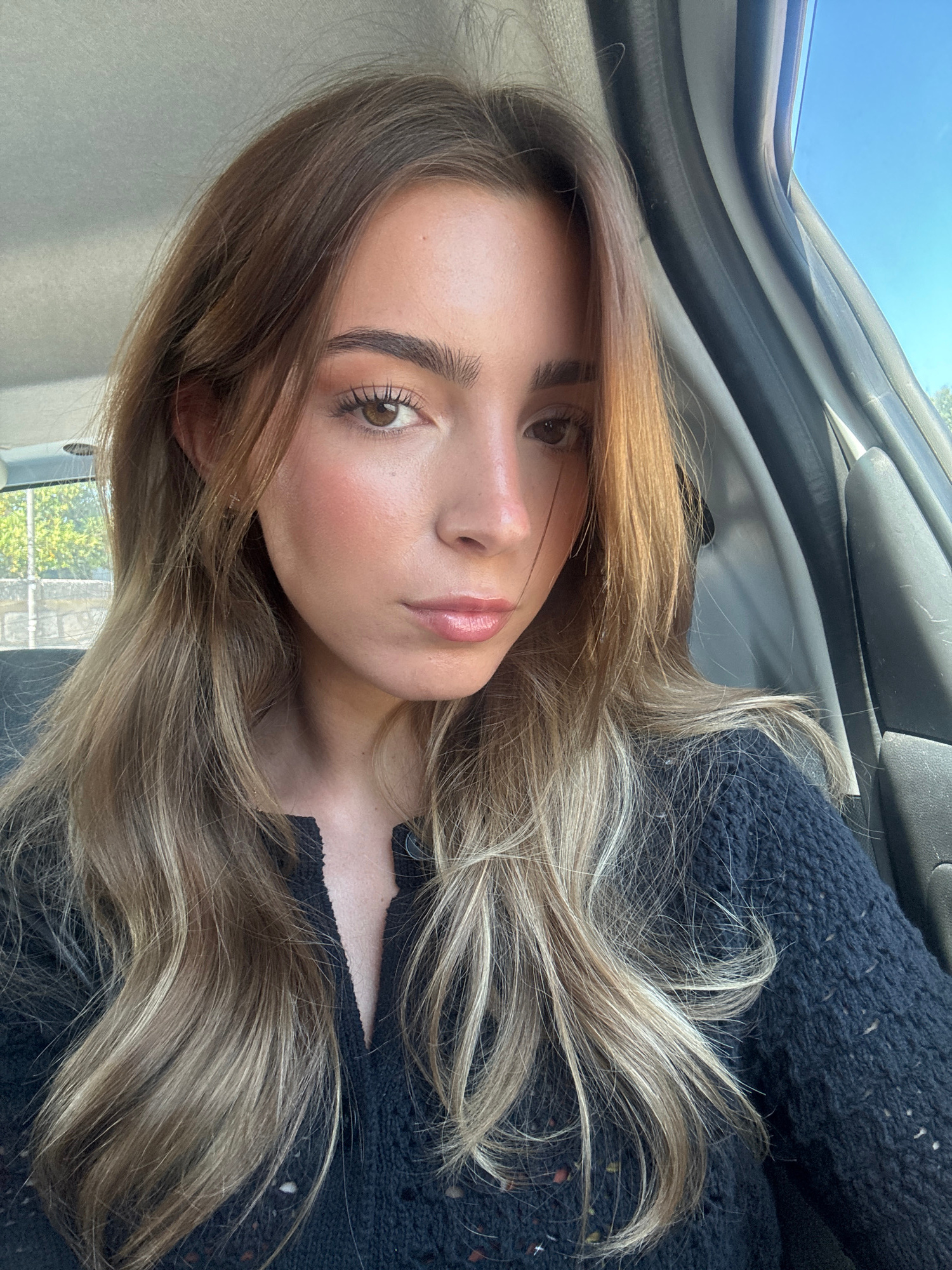 This image presents a close-up, head-and-shoulders portrait of a young adult female taken inside a vehicle in the city of Porto, Portugal. The female subject has fair skin, brown eyes, and long, wavy…read more