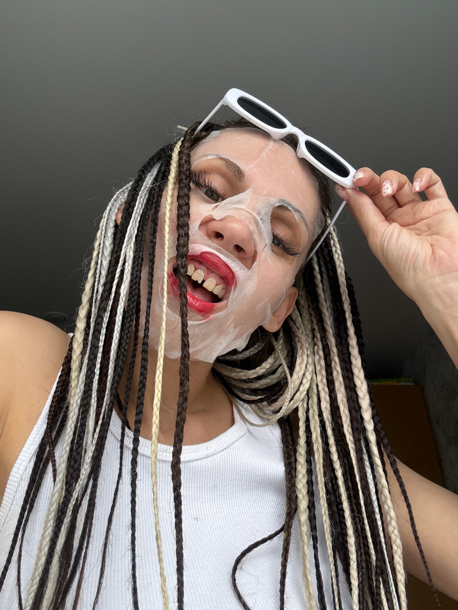 A woman with black, brown, and blonde braids lies on her back, wearing a white tank top and a white sheet mask. She is holding a pair of white sunglasses with black lenses above her face. Her lips are…read more