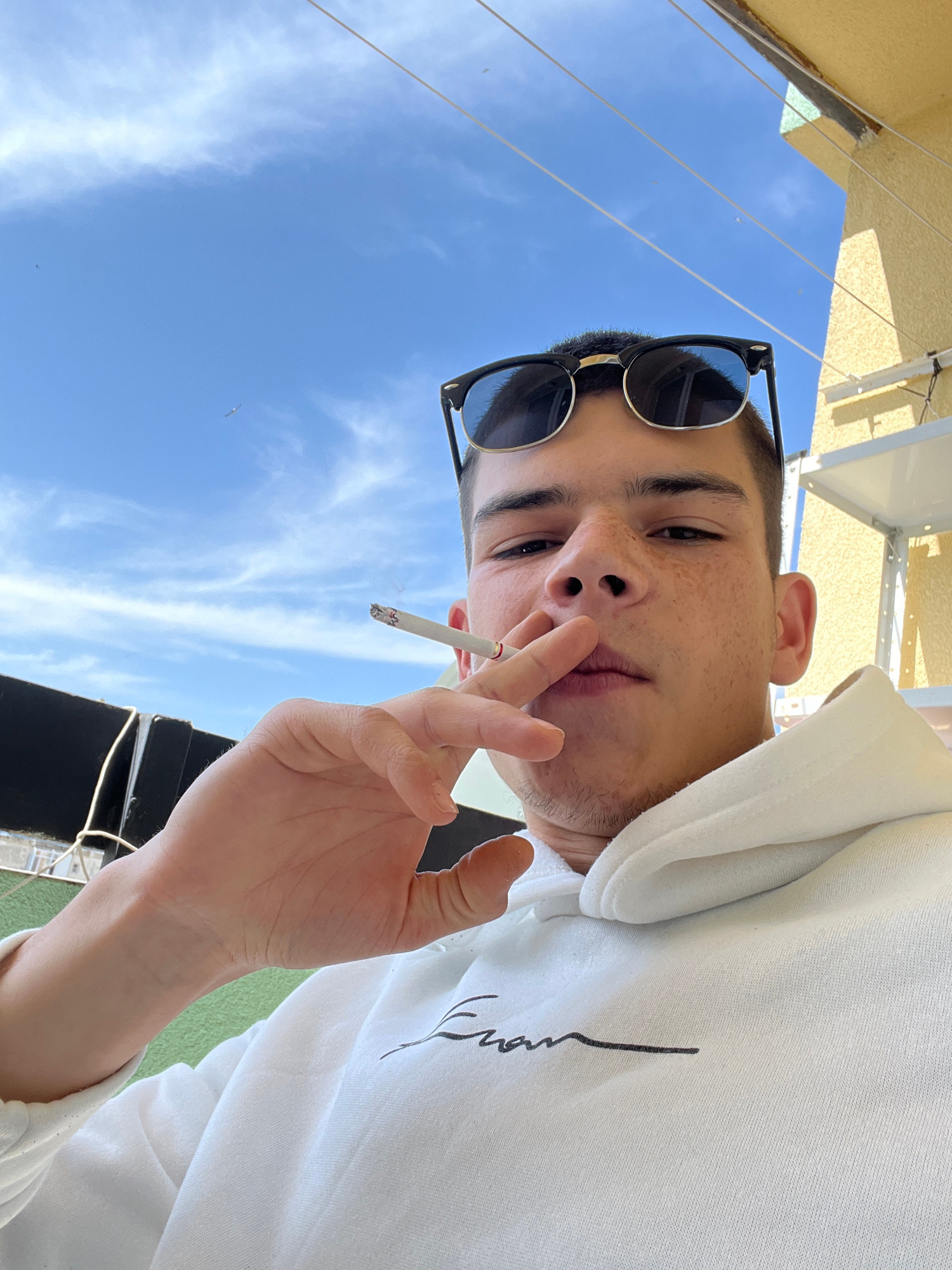 This image is a low-angle shot, oriented sideways, capturing a young person outdoors on a bright day. The subject, a person with short dark hair and freckles, is wearing a white hooded sweatshirt and…read more