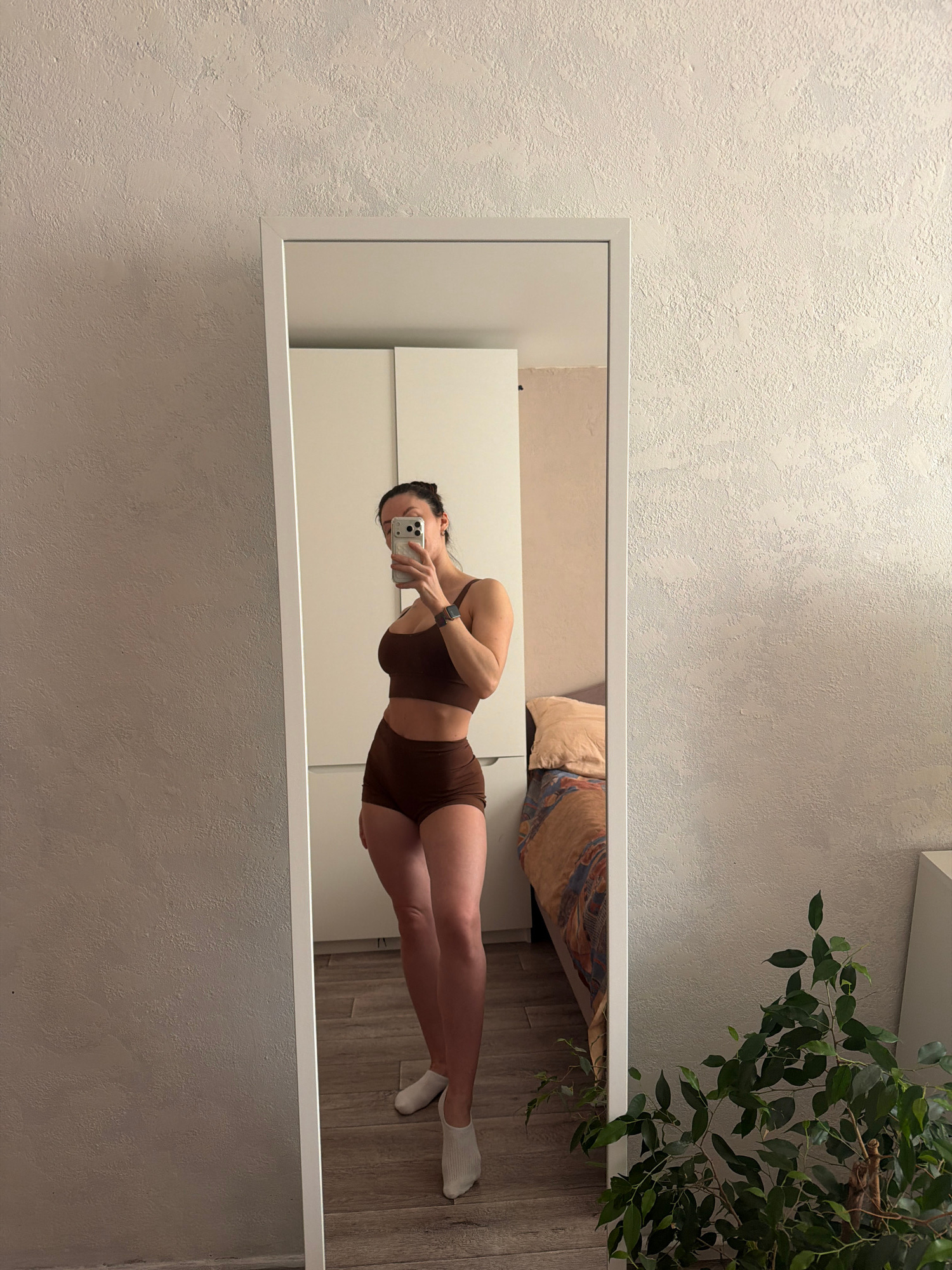 A person stands in front of a full-length mirror, holding a smartphone up to take a picture of themself. The person is wearing a brown two-piece outfit and white socks. The mirror is positioned agains…read more
