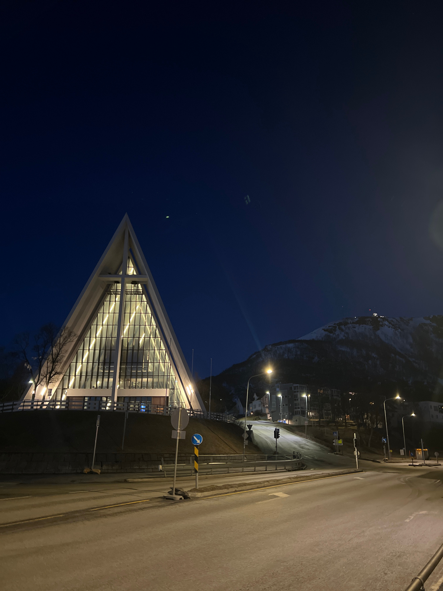 The image displays a nocturnal scene in Tromsø, Norway, featuring a distinctive modern building, a road, and a snow-covered mountain under a dark blue sky. The prominent subject in the mid-ground is a…read more