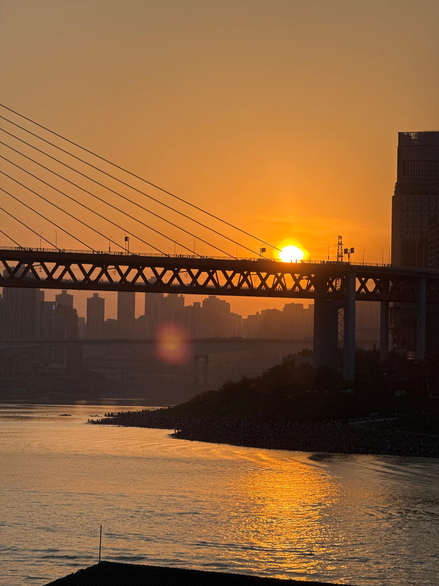 The image presents a sunset over a body of water, likely a river, with a bridge prominent in the foreground. The sun is positioned between the bridge's girders, creating a silhouette effect. The bridg…read more