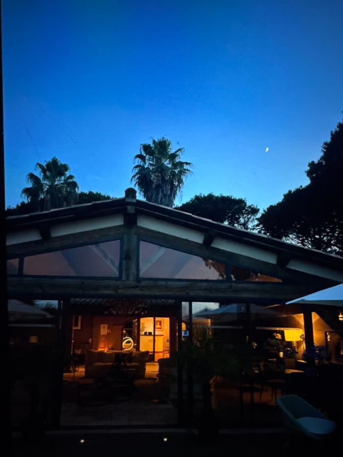 A nighttime scene features a structure with a peaked roof, possibly a covered patio or entrance. The structure is constructed with wooden beams and glass panels. To the left, a clear blue sky contrast…read more