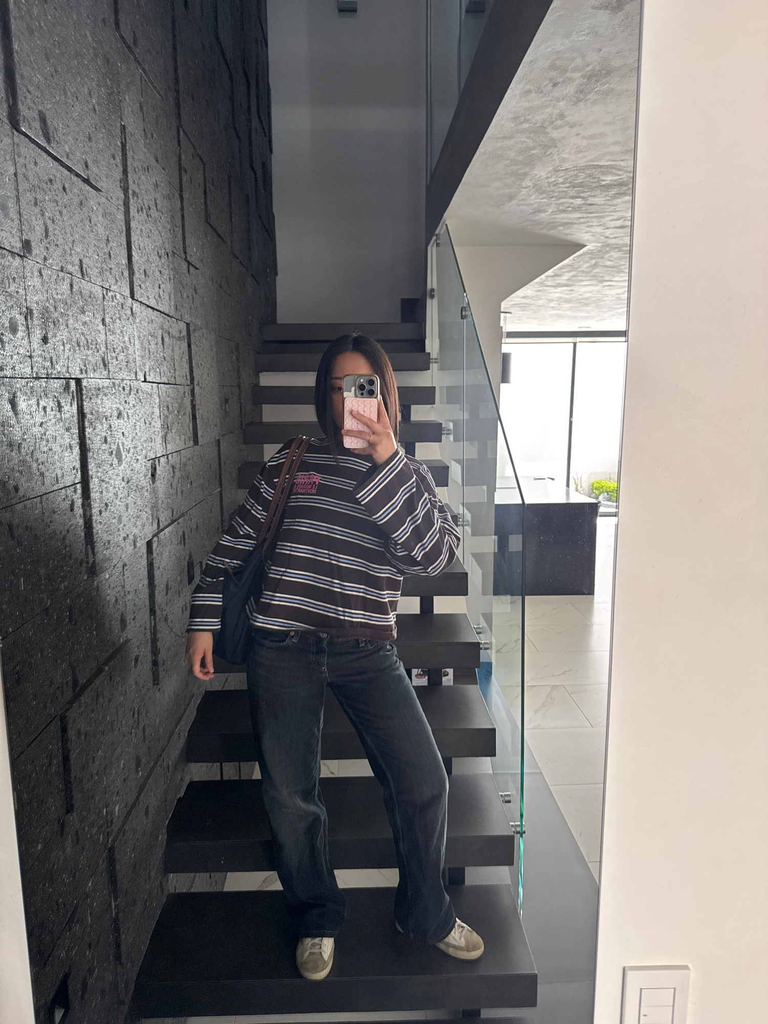 A person stands taking a selfie in a mirror in what appears to be an indoor space, possibly a building or a home, with a modern architectural design. The subject is wearing dark jeans, a horizontally…read more