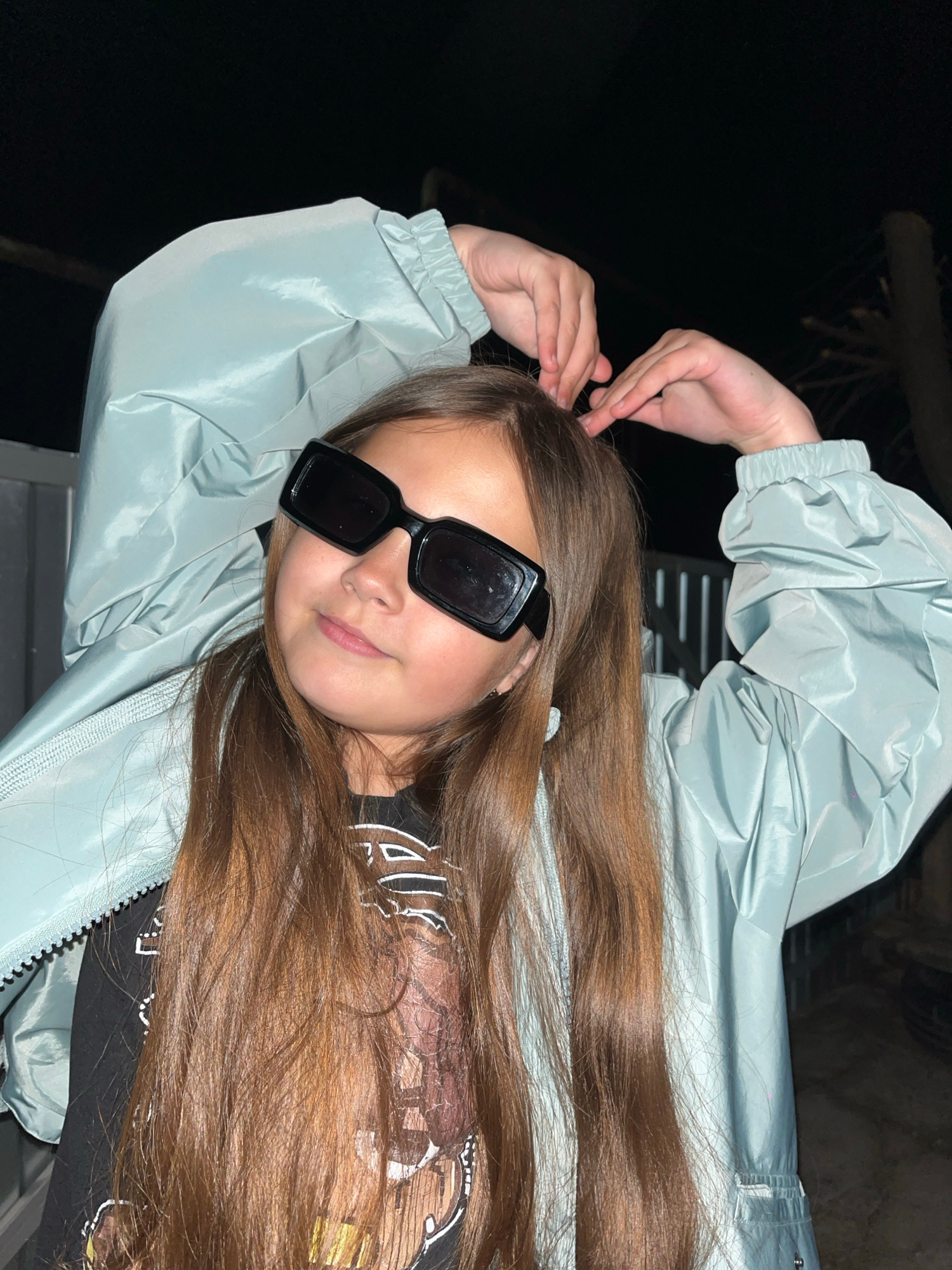 A girl with long brown hair, wearing a black printed t-shirt, a light blue jacket, and black square sunglasses, poses with her hands near her face. The background is dark and indistinct. The location…read more