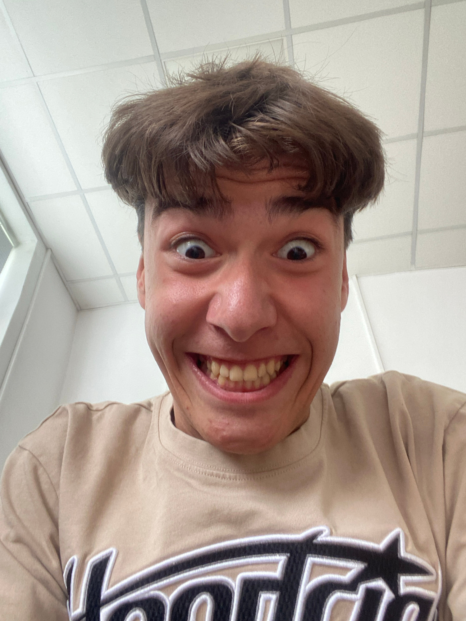 A young man with light brown hair is making a wide, exaggerated smile with his teeth showing. He has fair skin, dark eyes, and is wearing a beige t-shirt with a black and white design. He is looking d…read more