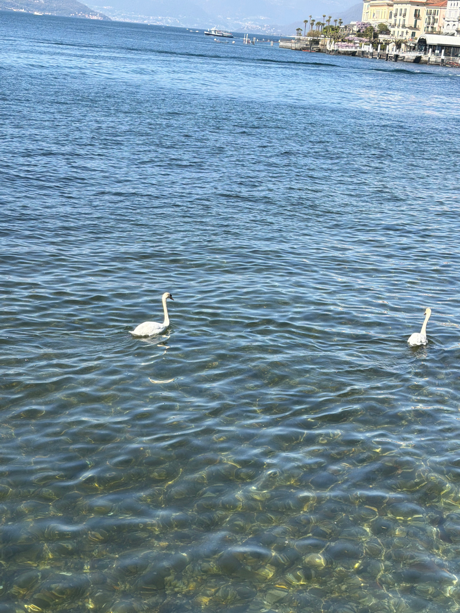 The image depicts the shoreline of San Giovanni, Italy. Calm, clear water reveals the lakebed below, while two swans float on the surface, each leaving a slight ripple. The shoreline includes building…read more