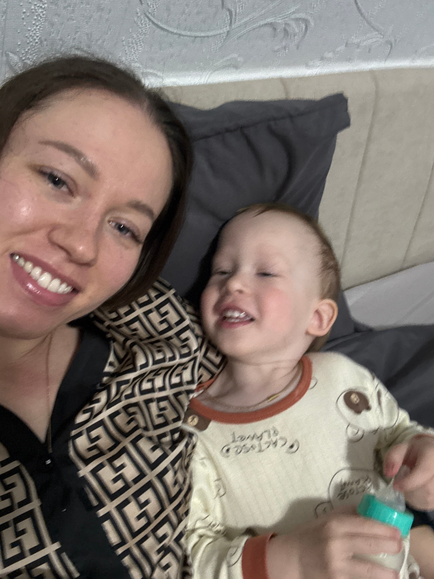 A selfie shows a woman with dark hair and a fair-skinned child lying on a gray pillow. The child is smiling and holding a baby bottle. The woman is also smiling. The scene appears to be indoors, likel…read more