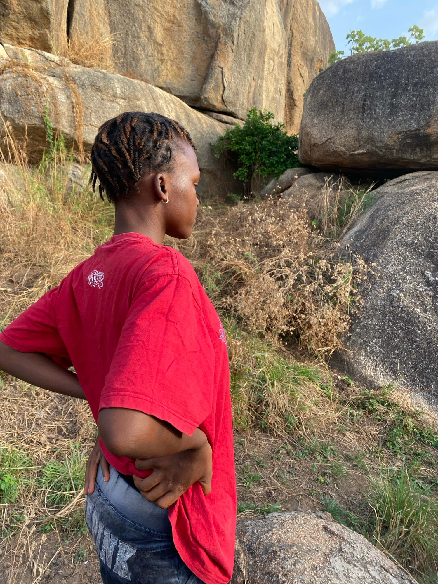 A young woman stands outside in a rocky, grassy area. She has braided hair, wears a small hoop earring, a red t-shirt, and dark jeans with what appear to be rhinestone embellishments. Her arms are croβ¦read more