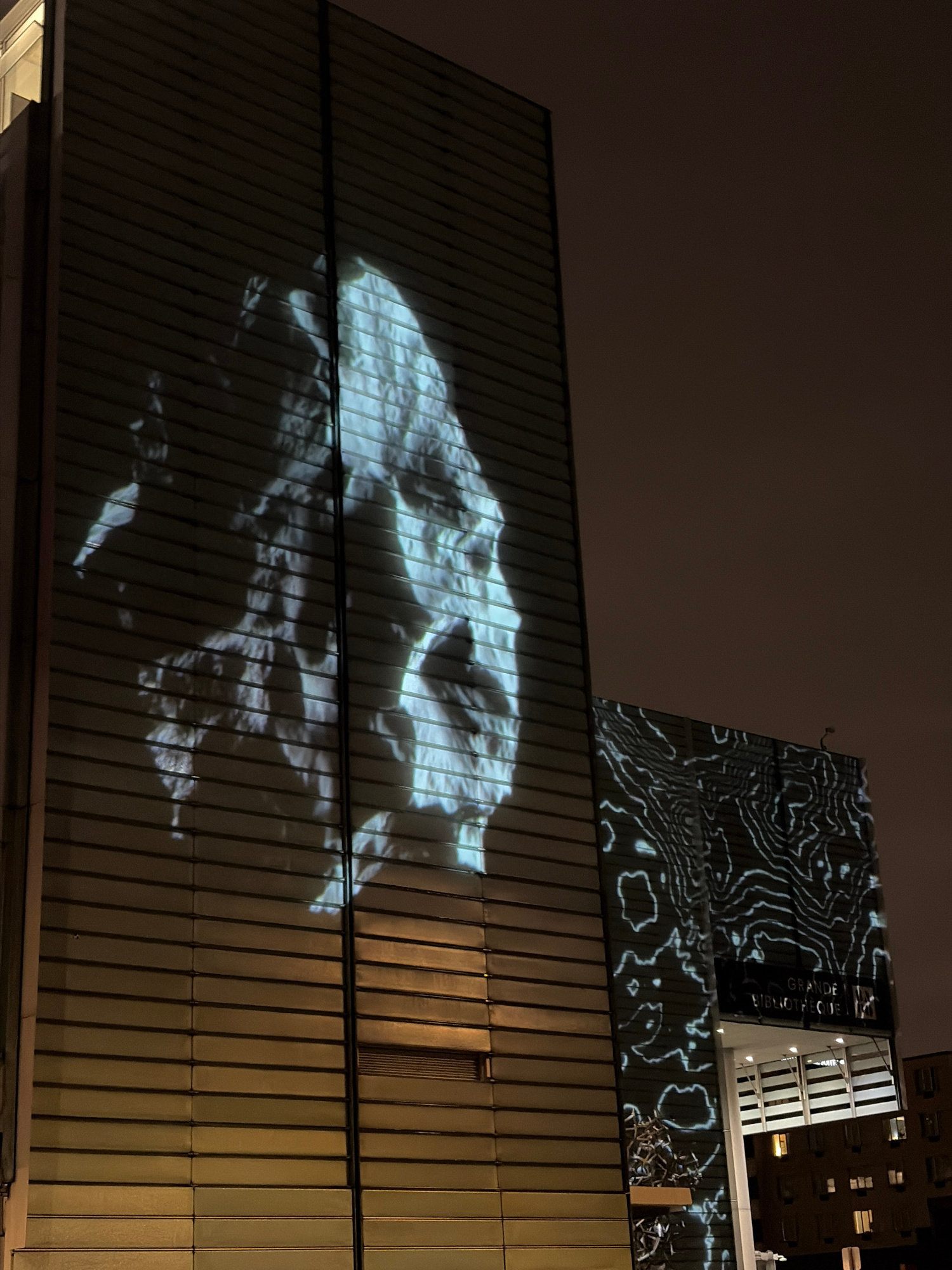 The image shows a building at night, possibly in Montreal, Canada, given the label "Grande Bibliothèque" visible on an adjacent structure. Two different projections are visible on different parts of t…read more