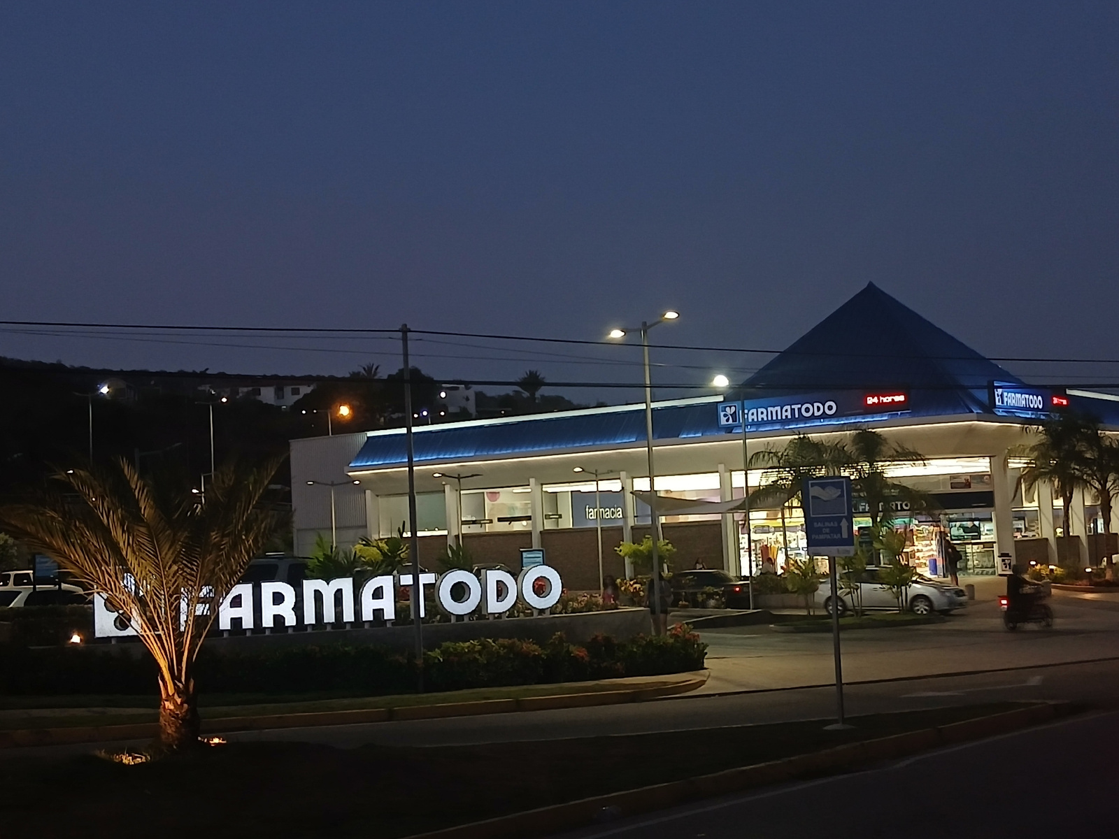 The image depicts a nighttime scene in Pampatar, Venezuela, featuring a Farmatodo store. The building is brightly lit with a blue-trimmed roof and a distinctive pyramid-shaped section. A large, illumi…read more