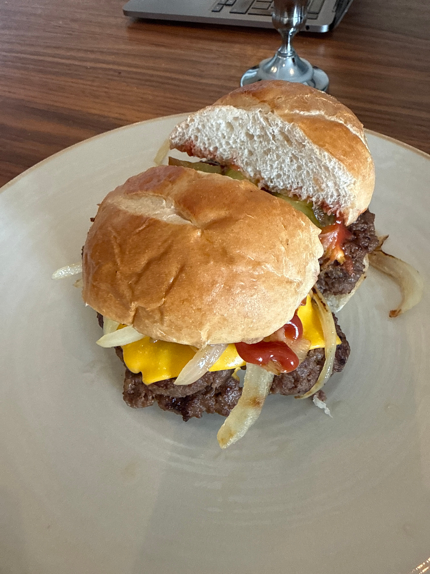 An eye-level close-up shot shows a hamburger on an off-white plate, sitting on a wooden surface, likely a table. To the left of the plate, a silver metallic object is partially visible. The hamburger'…read more