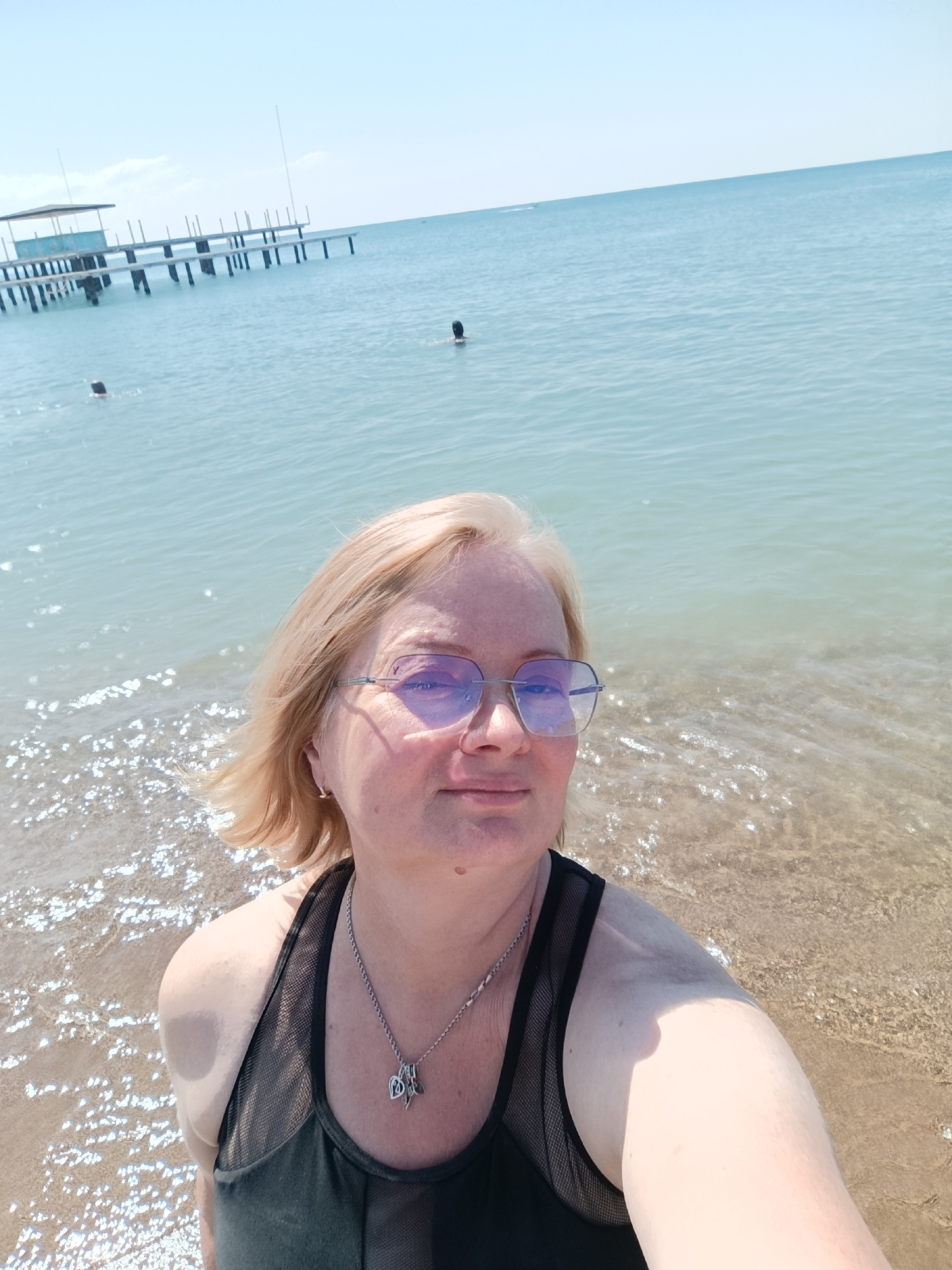The image depicts a middle-aged woman on a beach in Aksu, Turkey. She has short blonde hair, fair skin, and is wearing glasses and a black tank top with a silver necklace. She stands at the edge of th…read more