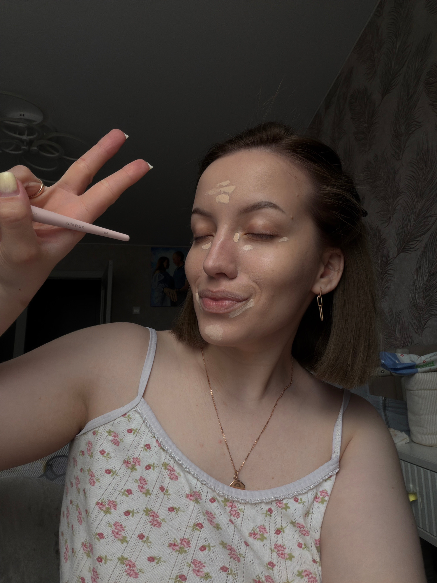 The image depicts a young woman indoors, likely in a private residence, as indicated by the personal items and décor in the background. The woman is facing away from the camera, at an angle to the sid…read more