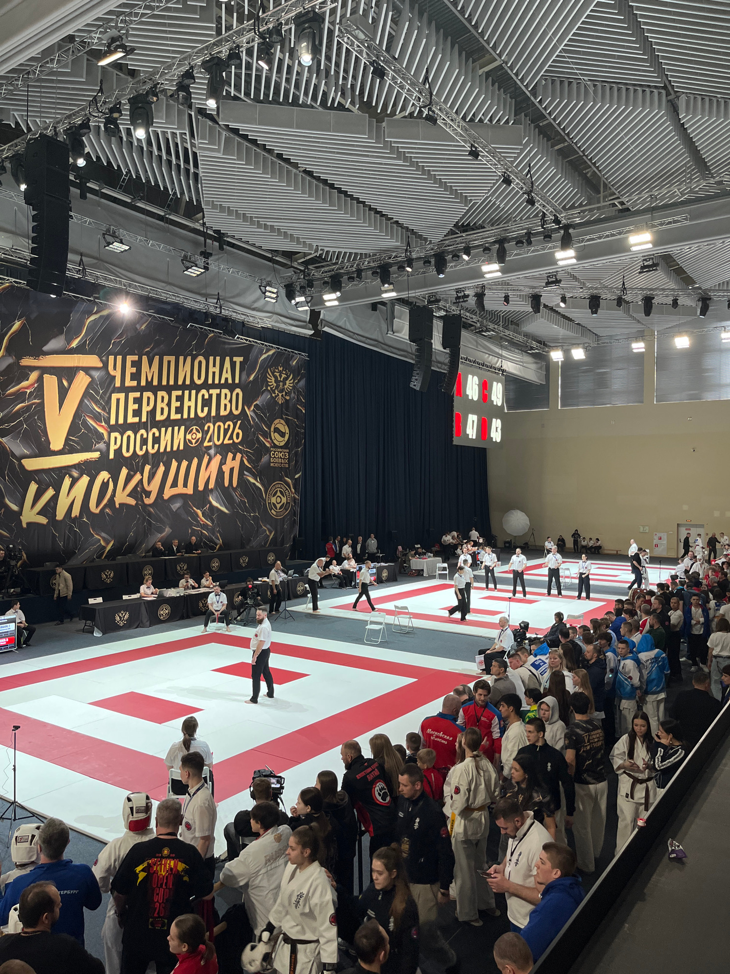 The image captures an indoor martial arts competition, specifically the "Russian Championship Championship 2026 Kyokushin" held in what appears to be Zhavoronki, Russia. A large banner displaying the…read more