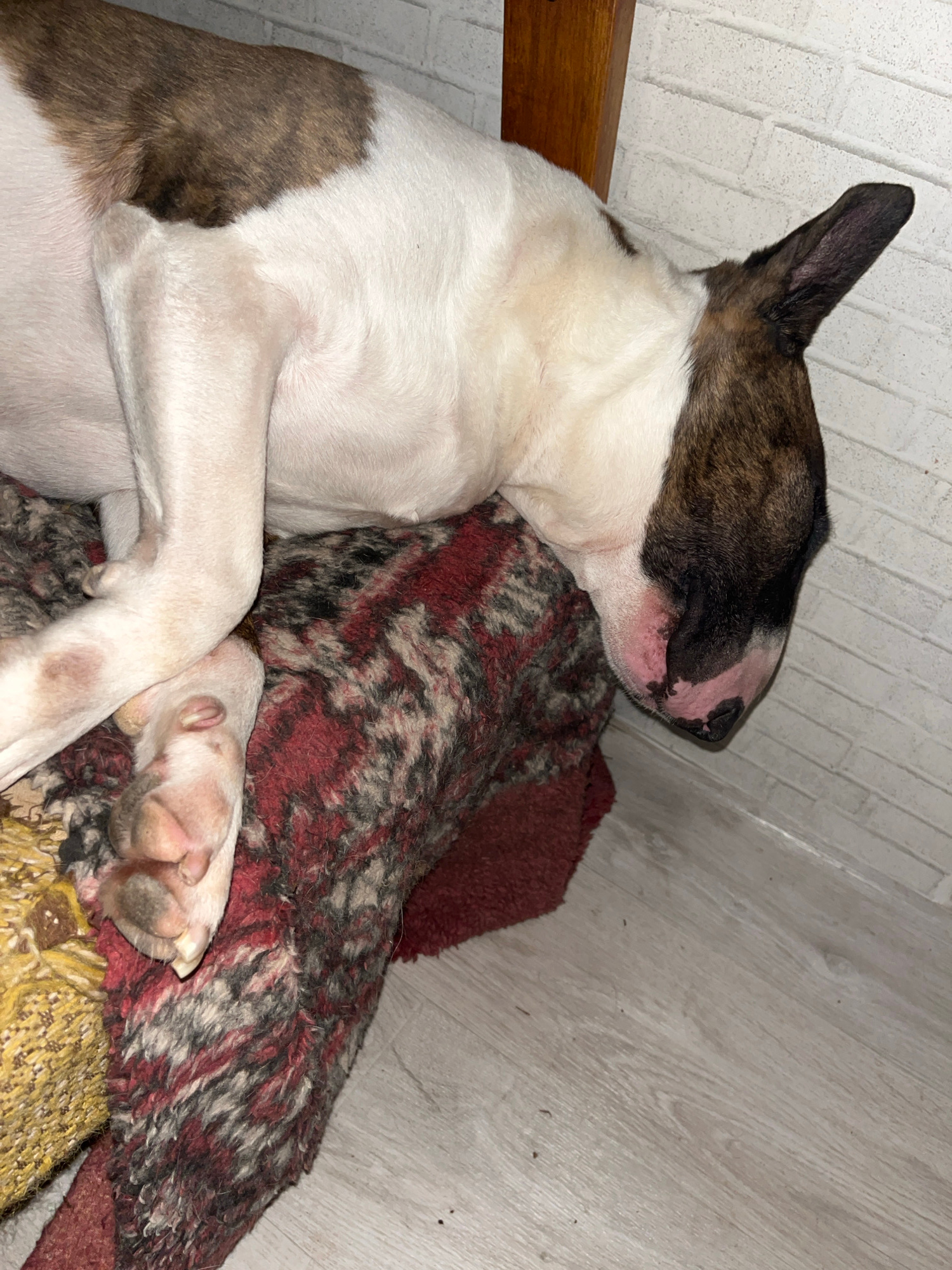 A Bull Terrier dog, with predominantly white fur and prominent brown brindle markings on its head and a patch on its side, is captured sleeping or resting indoors. The dog's eyes are closed, and its p…read more