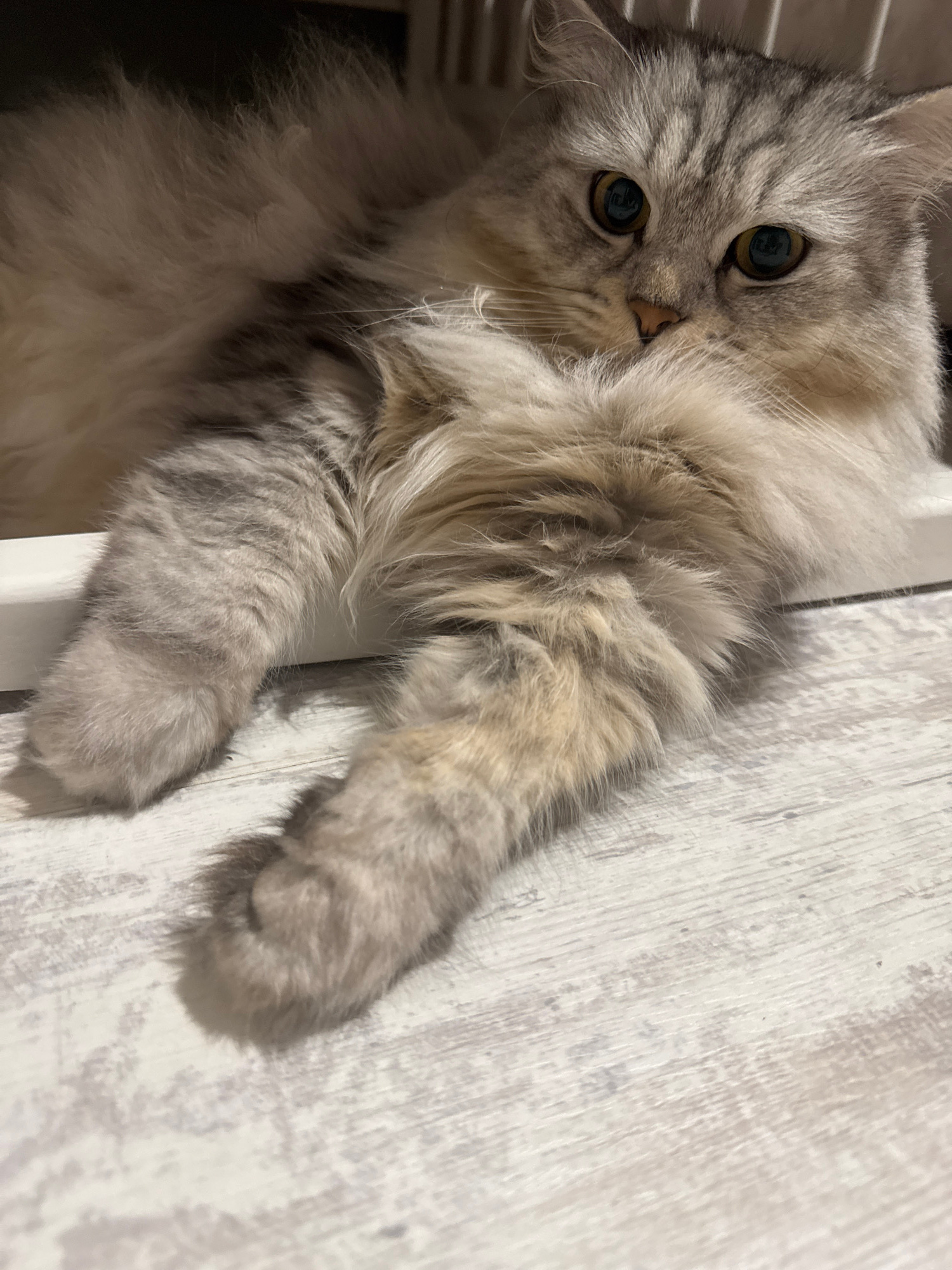 A fluffy, silver tabby cat is lying on a white, wooden-look surface. The cat is positioned at an angle, with its head near the top left of the image and its paws extended towards the right. Its eyes a…read more