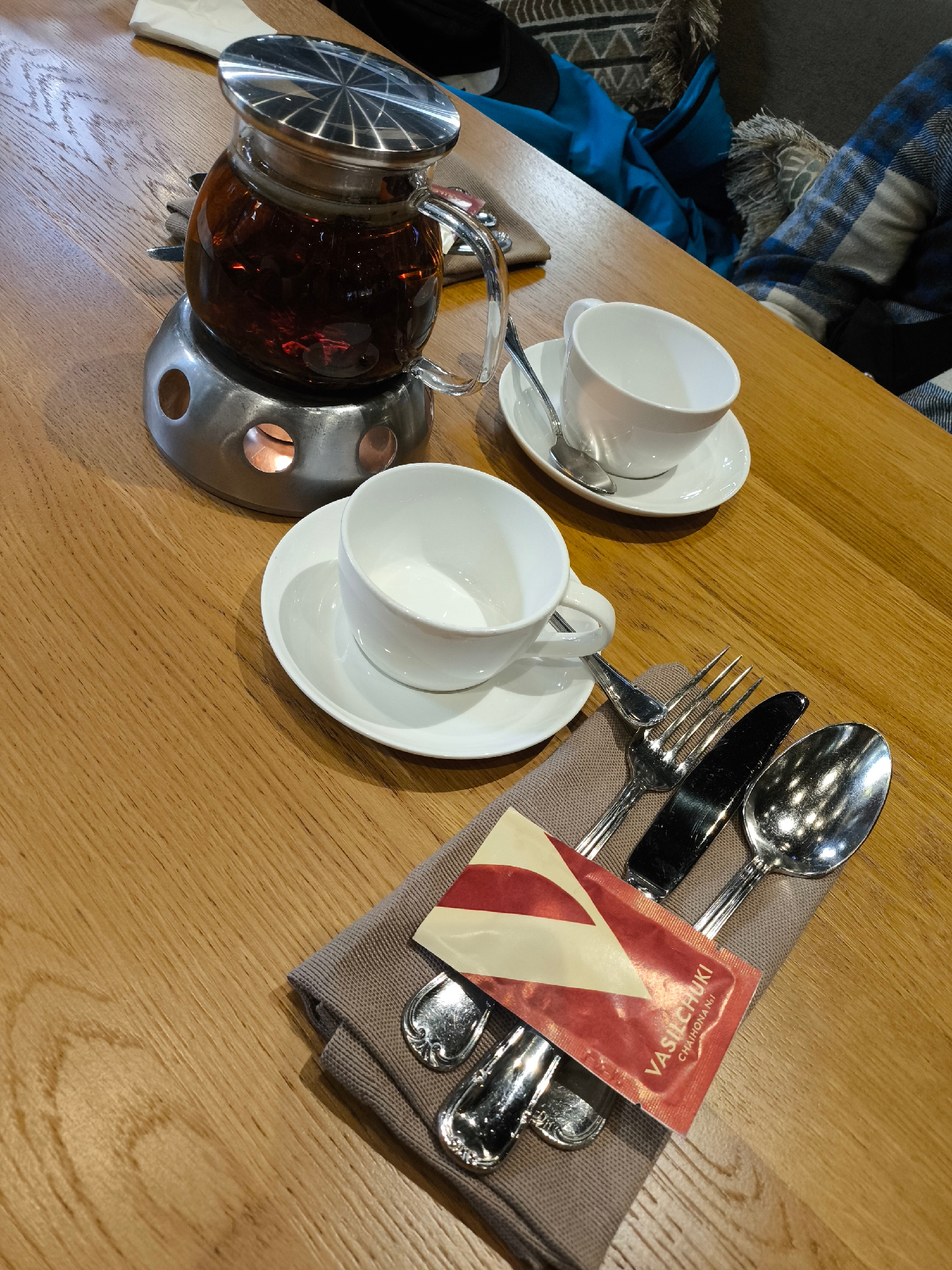 On a wooden table, there is a tea service set up for two people. The teapot, filled with dark liquid, is placed on a metal warmer. Two white teacups sit on white saucers. Each cup has a small spoon. A…read more