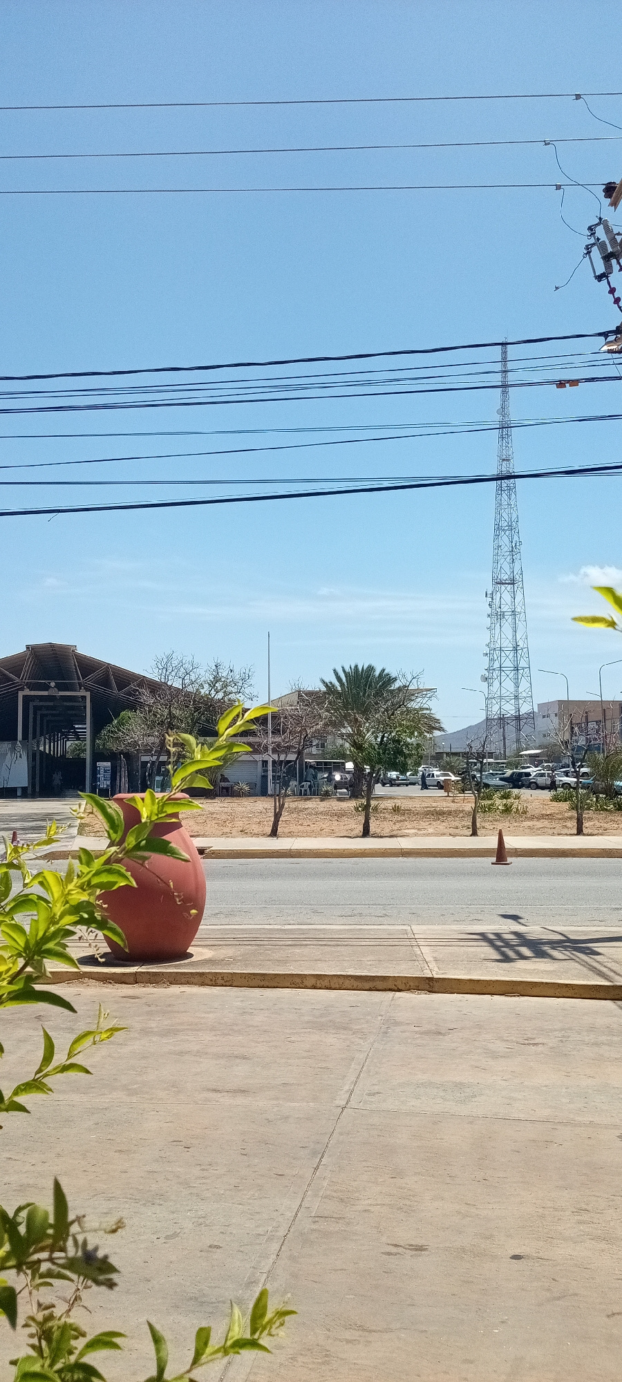The image shows a street scene in an urban area, likely during daylight hours under a clear, blue sky. Overhead power lines are prominently visible against the sky. A metal communications tower rises…read more