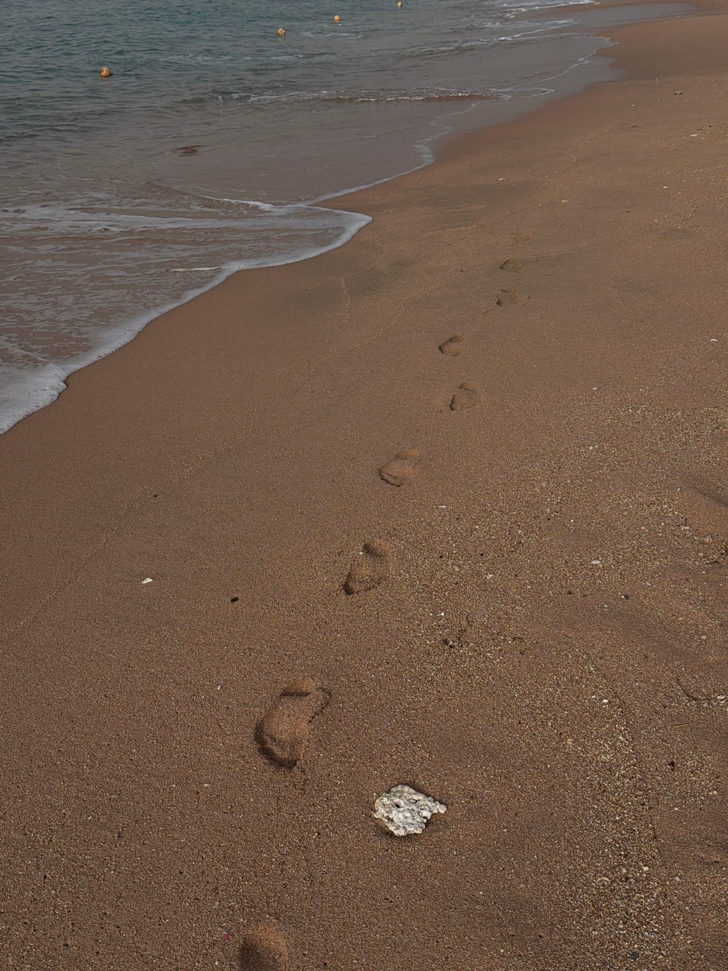 The image shows a section of a sandy beach in Sharm El Sheikh, Egypt. A line of receding waves marks the boundary between the sea and the shore on the left side of the frame. A set of footprints exten…read more