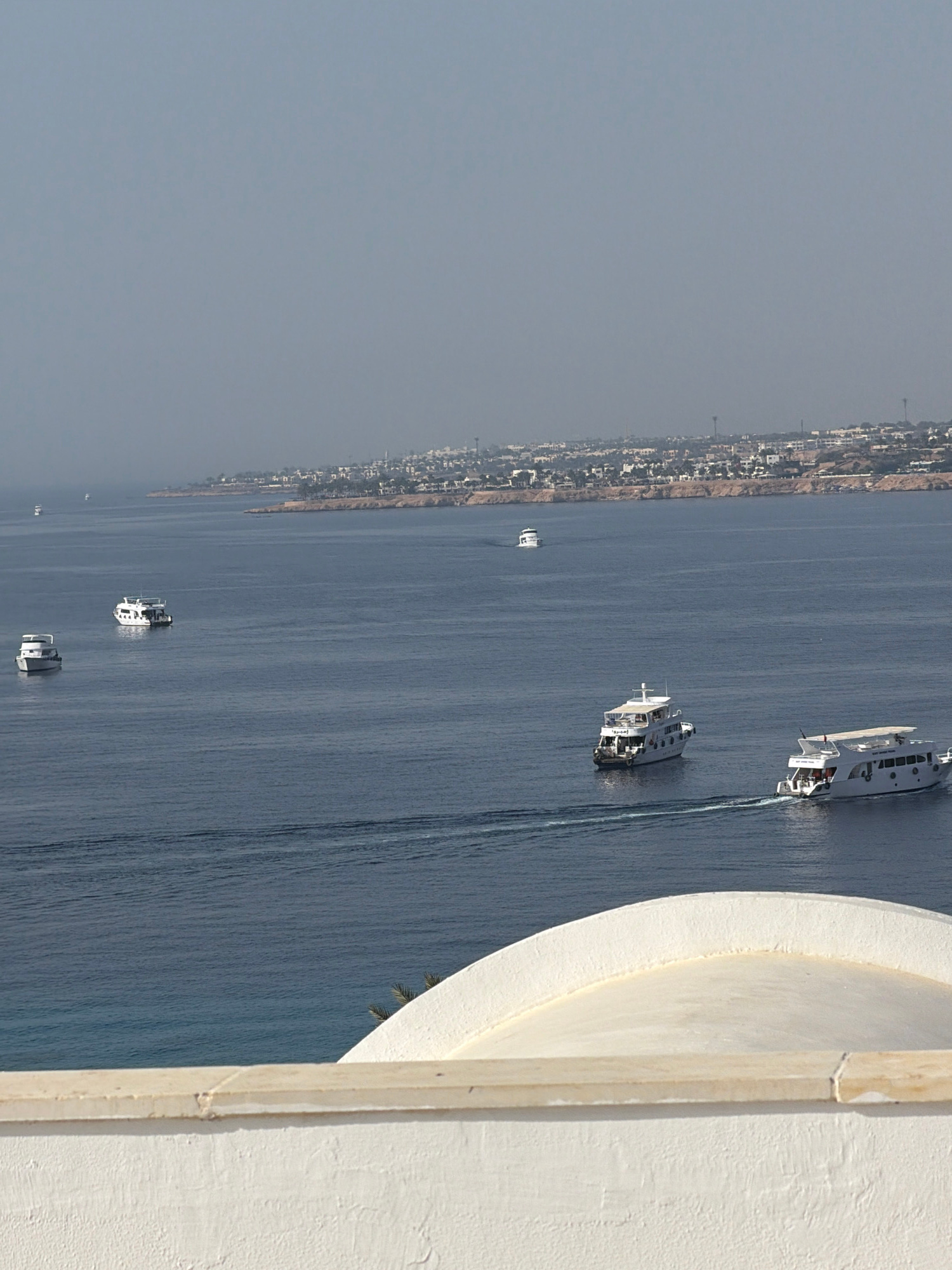 The image, taken from an elevated perspective, captures a serene daytime view over a calm blue sea. The horizon reveals a distant coastline populated with numerous buildings, suggesting a coastal town…read more