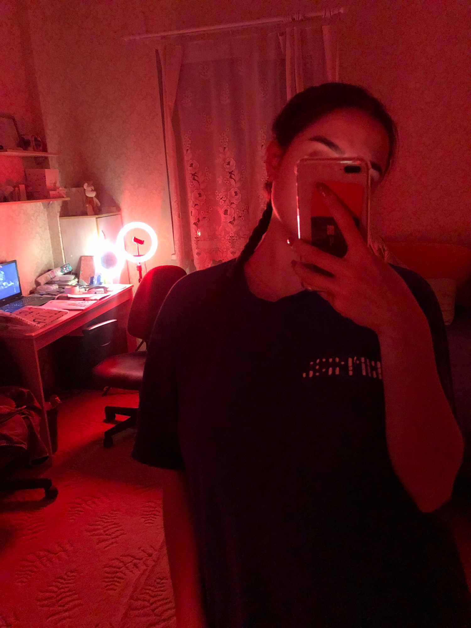 An interior scene in Noviy, Russia, depicted with pervasive red lighting. A female individual, partially obscured, is positioned centrally, taking a selfie or reflection photograph with a light-colore…read more