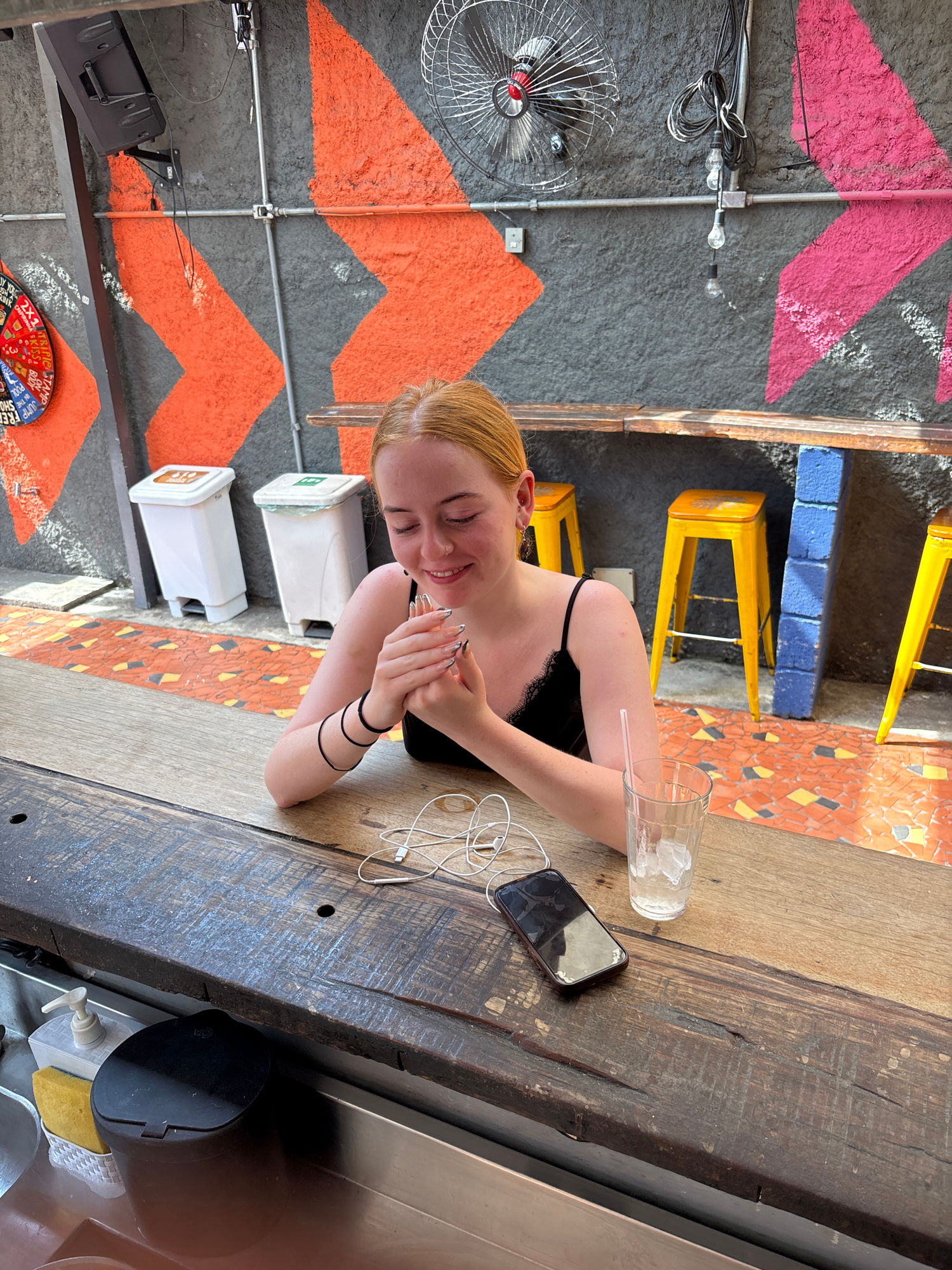 A young woman with reddish-blonde hair is seated at a rustic wooden counter, observed from a slightly elevated angle in what appears to be a vibrant, urban cafe or bar in São Paulo, Brazil. She is wea…read more