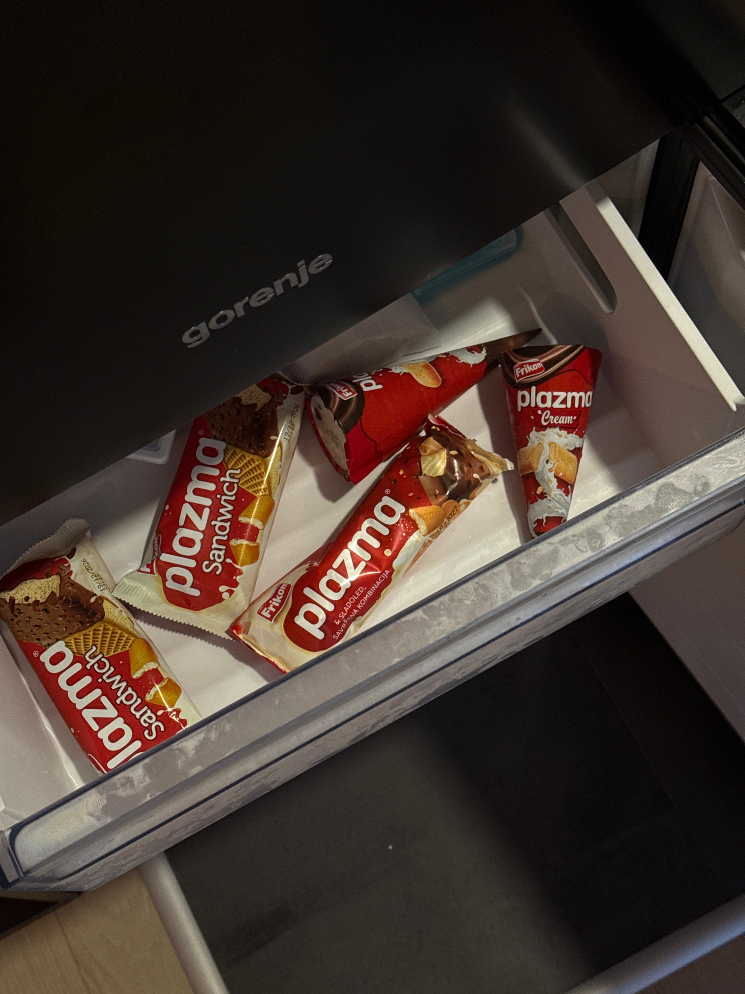 The image shows a drawer inside a Gorenje refrigerator, containing several "Plazma" brand ice cream products. These include "Plazma Cream" cones and "Plazma Sandwich" ice cream bars. The products are…read more