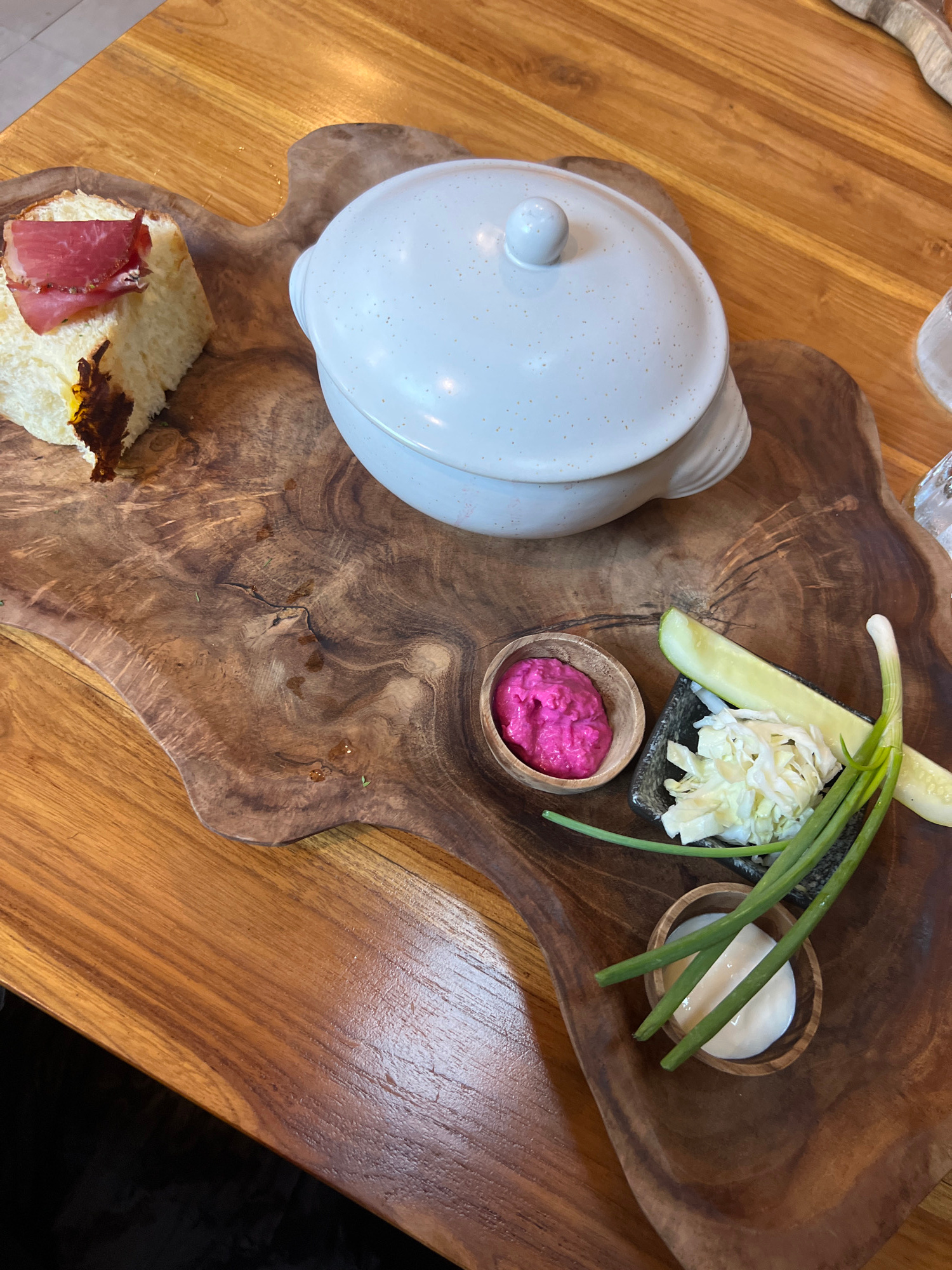 A top-down shot shows a food dish served at a restaurant in Ubud, Indonesia. The food rests on a irregularly-shaped, light and dark brown wooden serving tray. On the upper right of the tray are small…read more