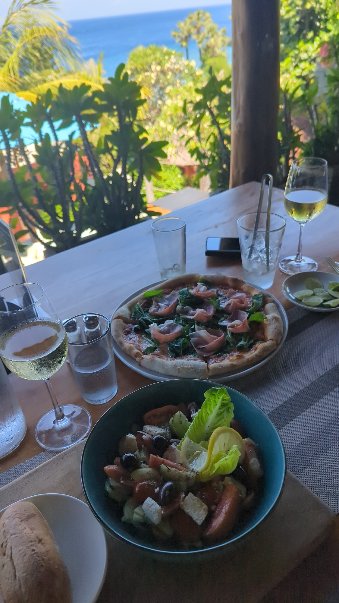 A table is set with a meal that includes pizza, salad, bread, and white wine. The scene is outside with a view of palm trees and the ocean. The location is likely Abang, Indonesia.