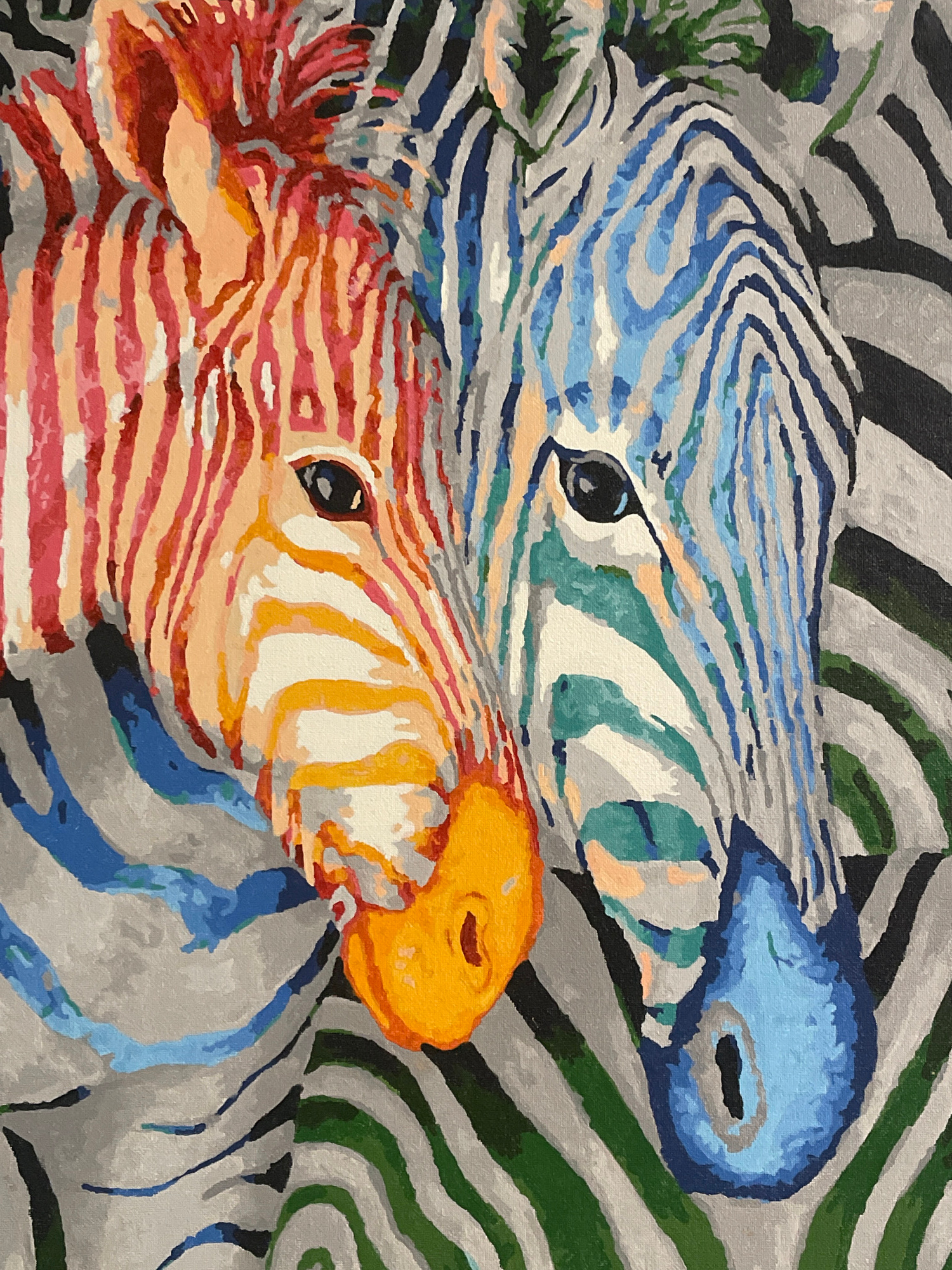 The image depicts two stylized zebra heads, one predominantly blue and the other orange, overlaid against a background of abstract zebra stripes in varying shades of grey, green, and black. The zebras…read more