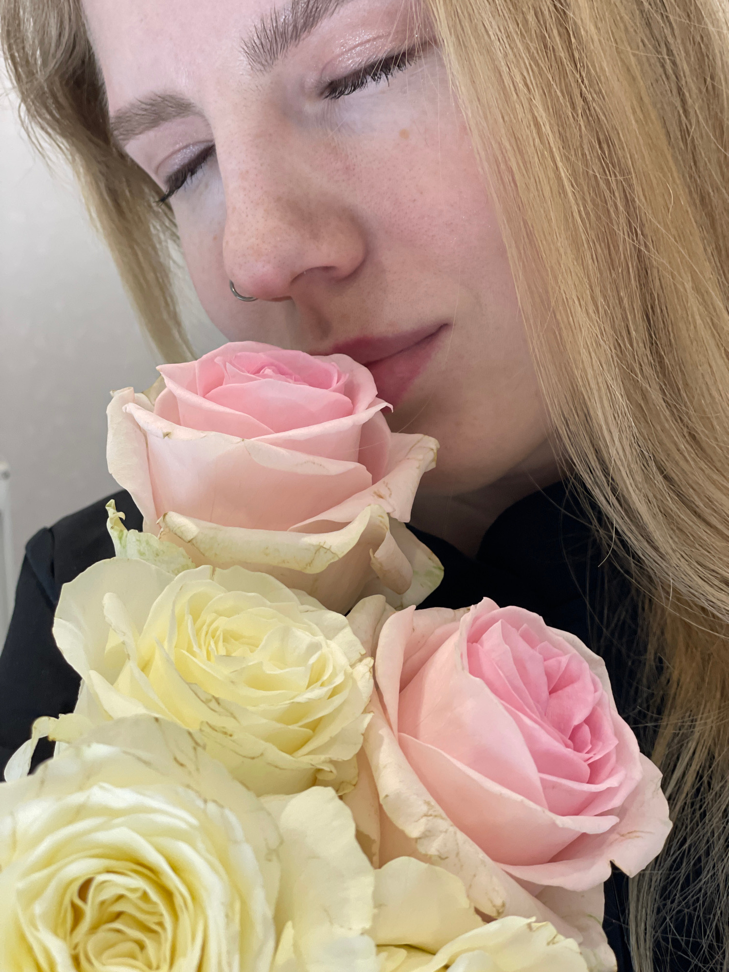 A close-up, slightly tilted image shows a fair-skinned person with blonde hair next to a bouquet of roses. The person has visible freckles, a nose piercing, and their eyes are closed or looking down.…read more