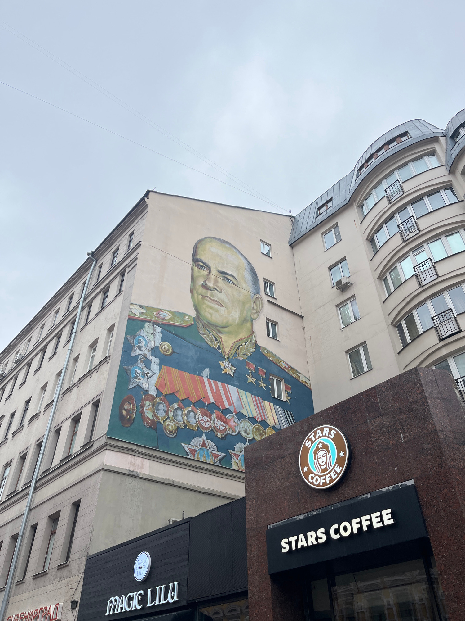 The image shows a building in Moscow, Russia, adorned with a large mural of Marshal Georgy Zhukov. A "Stars Coffee" sign is attached to the building. Additionally, there is a sign for "Magic Lilu" vis…read more