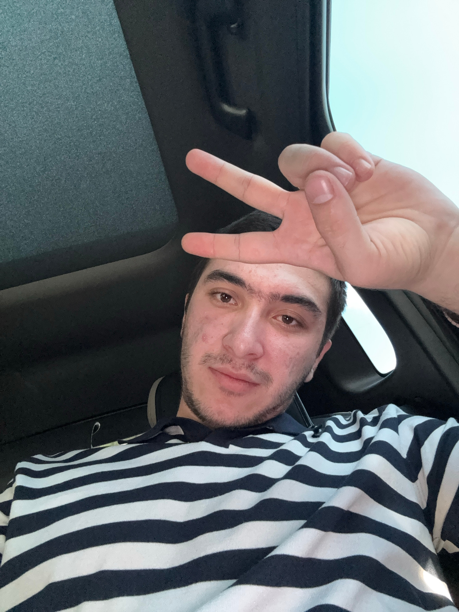 A young man is seated in a car, visible through the sunroof. He is making a peace sign with his right hand. He has short dark hair and a beard. He is wearing a striped black and white shirt. The inter…read more