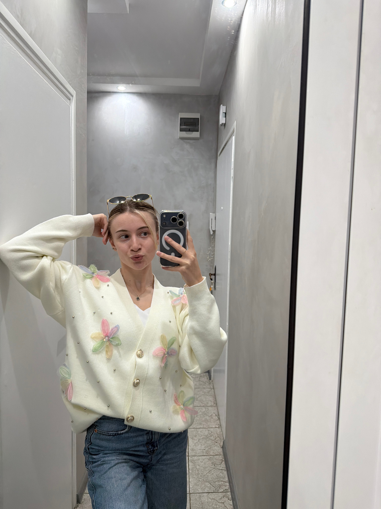 A young woman is taking a selfie in a mirror, likely in a bathroom or similar space. She is wearing a white cardigan adorned with colorful floral embellishments and blue jeans. Sunglasses are perched…read more
