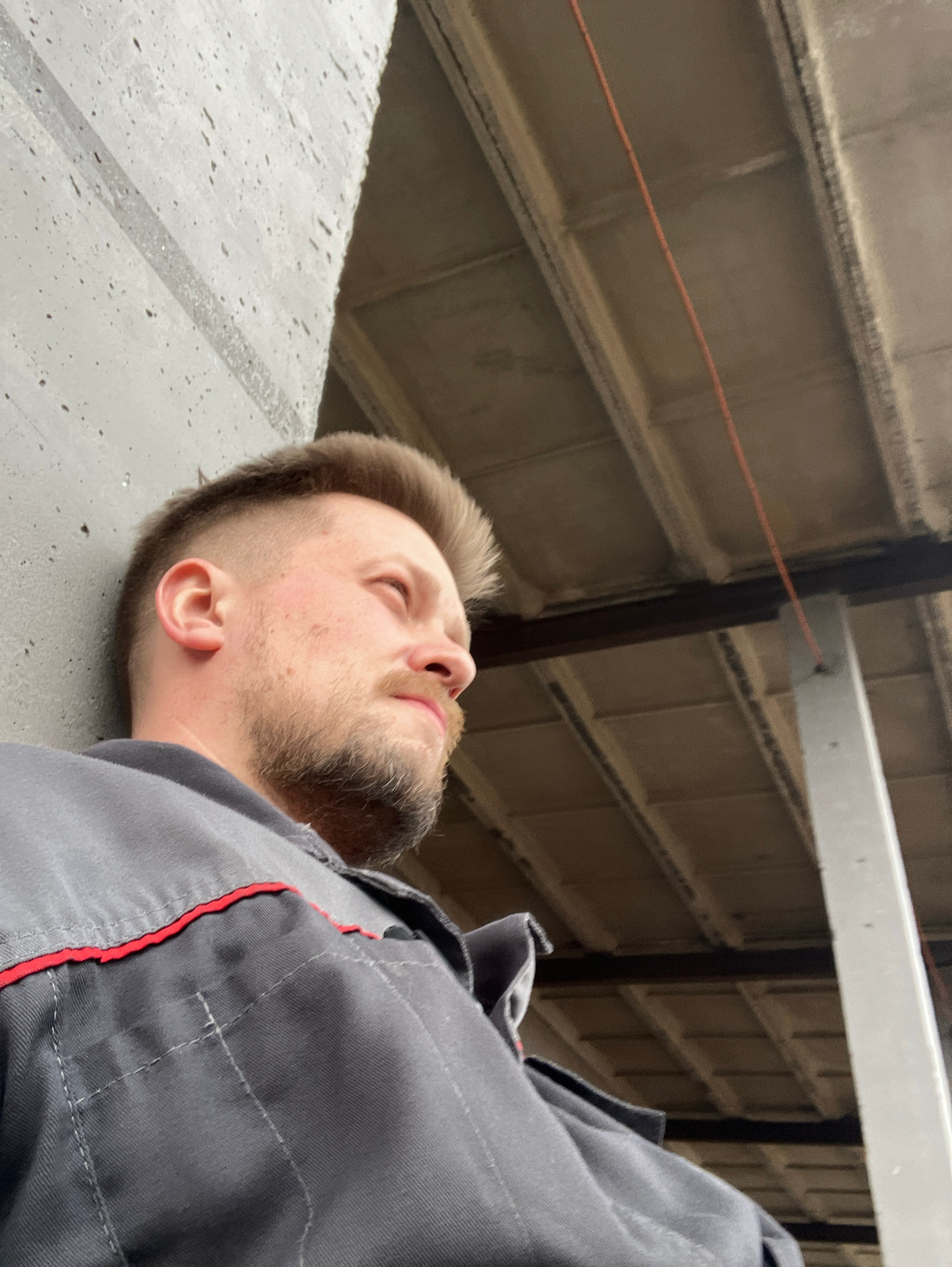 The image features a man with light brown hair and a beard, seen from the chest up, lying on his side and looking upwards with his eyes closed. He is wearing a dark gray collared shirt with red trim a…read more