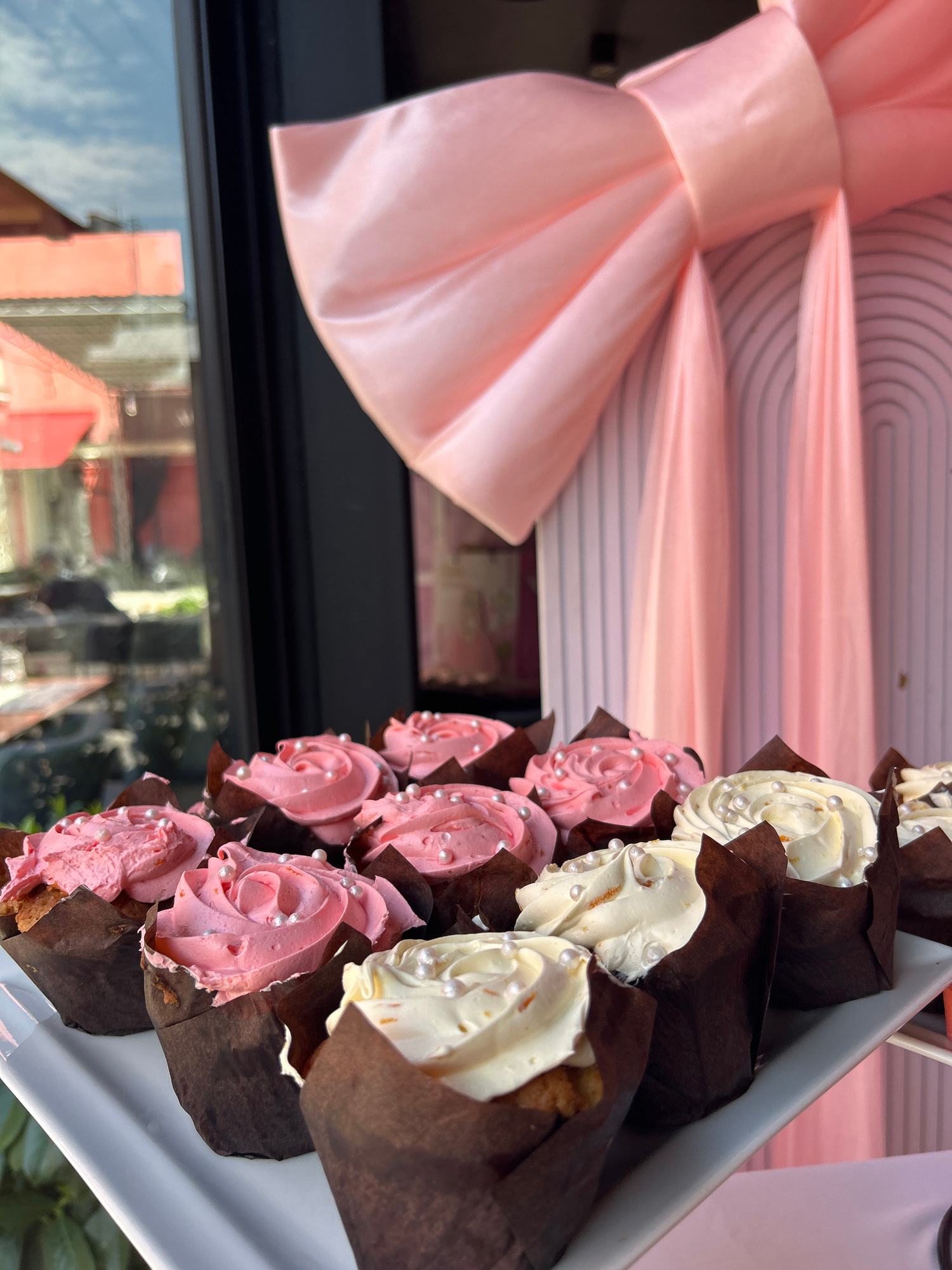This close-up image captures a delightful display of cupcakes and decorative pink fabric, set indoors, likely during the daytime. On the right side of the frame, a white rectangular tray presents sev…read more