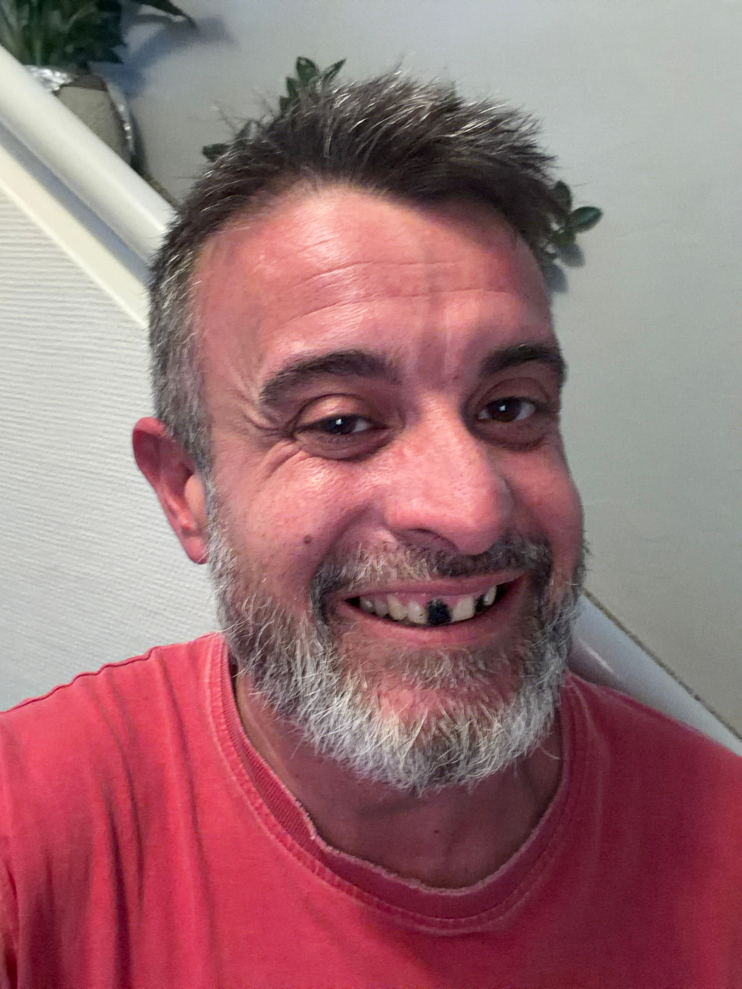 A middle-aged man with graying hair and a gray beard is smiling into the camera. He is wearing a red shirt. The background appears to be a wall and possibly some greenery. There is no information avai…read more