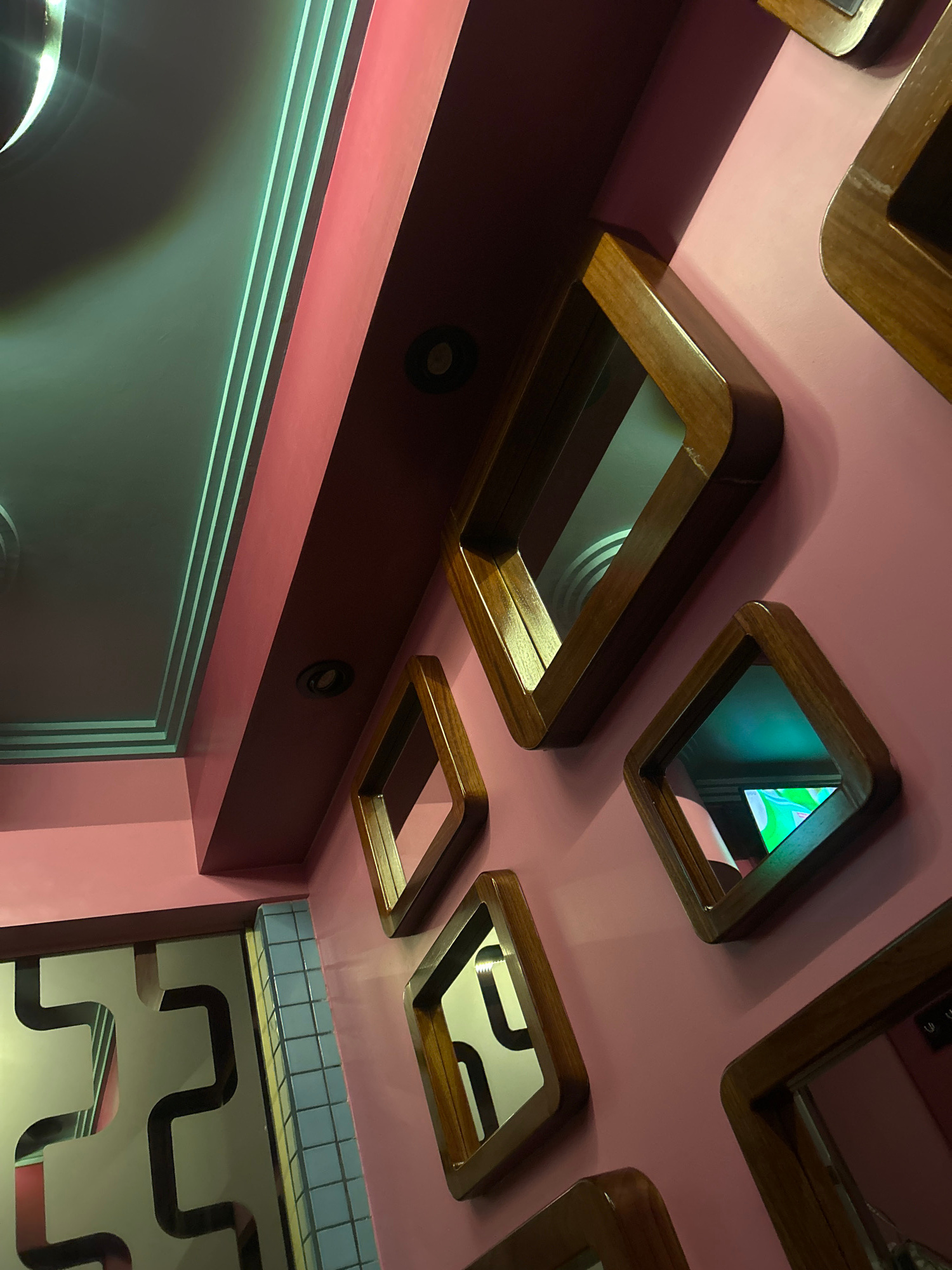 The image shows a view looking up at a ceiling and parts of walls. The ceiling is painted a muted pink and features a grid-like pattern of recessed square and rectangular wooden frames. These frames r…read more
