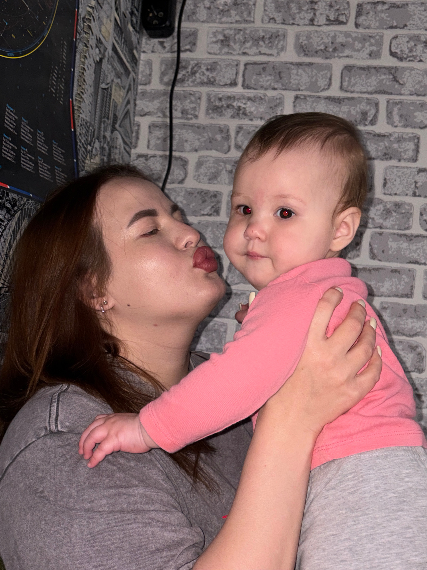 A woman and a baby are lying down. The woman is wearing a gray shirt. The baby is wearing a pink long-sleeved shirt and gray pants. The woman's face is close to the baby's. The background is a gray br…read more